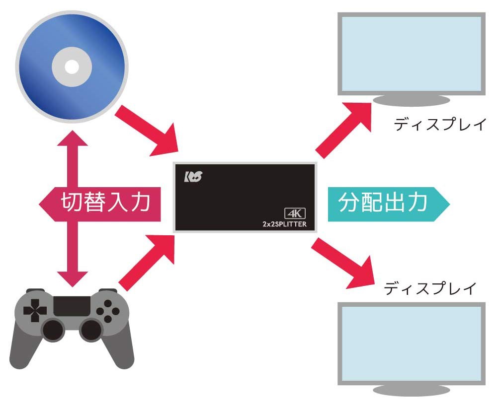 | ※分配器からは同じ映像が出力されます。別々の映像は出力できません。 ※HDMI分配器同士を接続するカスケード接続には対応していません。 | ||||||||||||||||||||