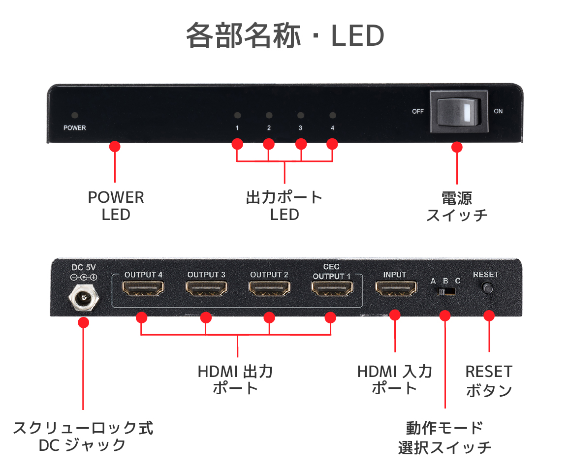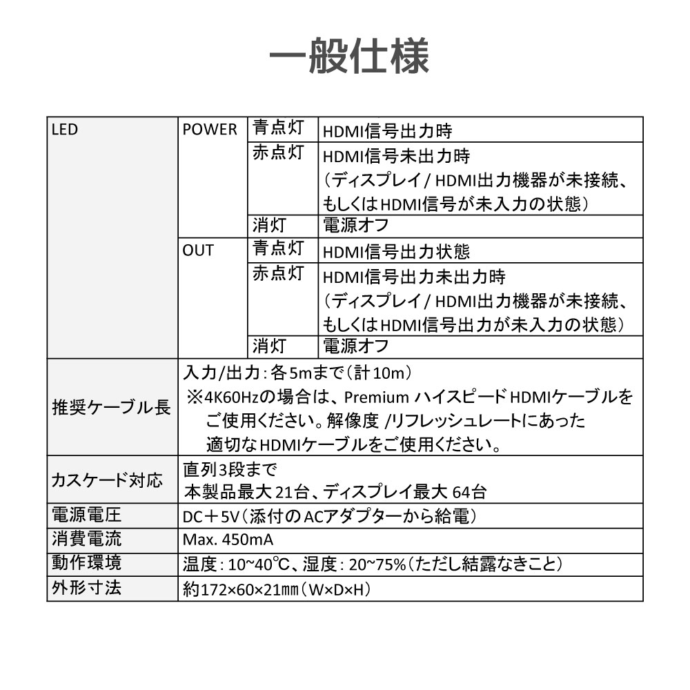 | 本製品は、ビデオレコーダーやパソコン、ゲーム機器など1台の映像機器と接続し、4台のテレビ・ ディスプレイに出力することのできるHDMI分配器です。