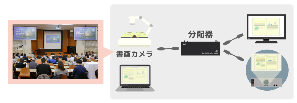 | 分配利用例(2) 書画カメラ、PC映像を簡単共有 | ||||||||||||