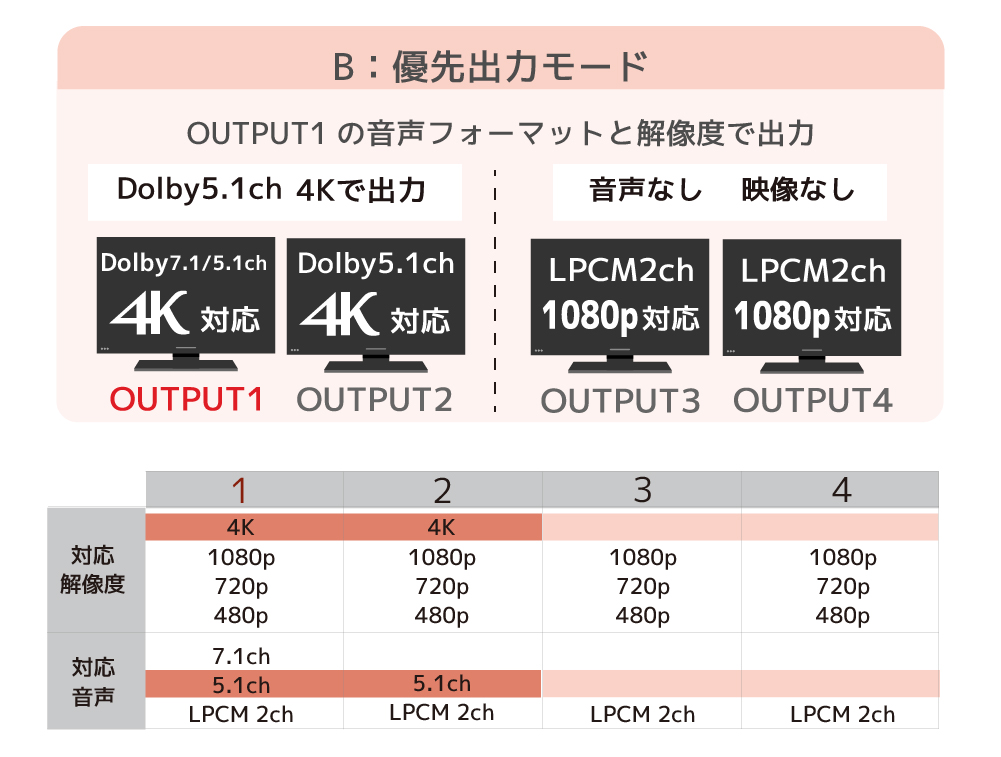 | ディスプレイ4台に共通する音声フォーマットと解像度で出力します。