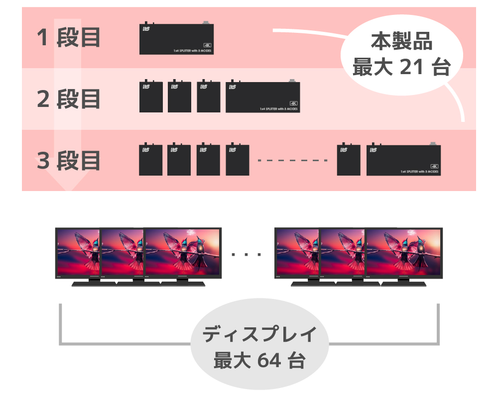 | 本製品は最大3段まで、カスケード接続することができます。もちろん、2分配モデル、4分配モデルの混在した環境でもお使いいただけます。 たとえば、すべて4分配モデルでカスケード接続した場合の最大数は、本製品が21台、ディスプレイが64台となります。 ※最大接続数は理論値です。