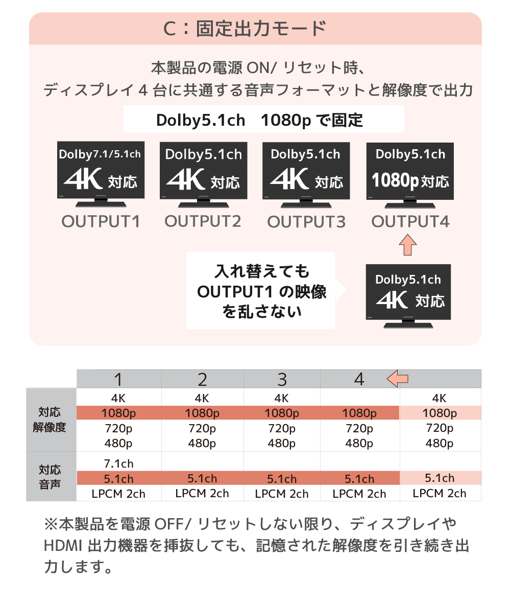 | 本製品の電源ON/リセット時にディスプレイ4台に共通する音声フォーマットと解像度で出力します。