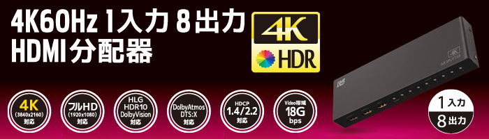 HDCP2.2に対応、HDR映像ソースも分配 本製品はHDCP2.2に対応。 4KチューナーやUHD映像コンテンツにもそのままご使用いただけます。 また、標準的なHDR規格である「HDR10」や、映画や海外ドラマなどで活用されるハイクオリティなHDR「Dolby Vision」、放送用HDRである「HLG」にも対応、4Kチューナーなどを接続した場合でもダイナミックな映像を楽しむことができます。 | ||||||||||||||||||||