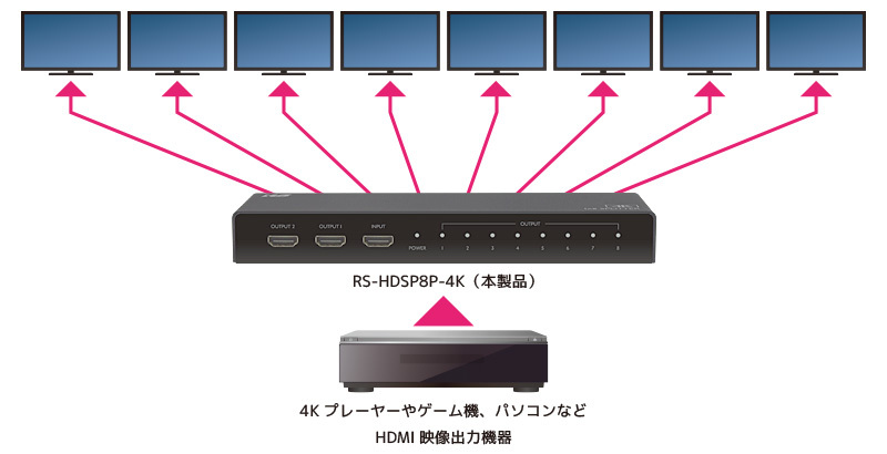 1つの映像信号を8つに分配する 4K対応HDMI分配器 本製品は、ビデオレコーダーやパソコン、ゲーム機器のHDMI信号を8分配することのできるHDMI分配器です。4K 60Hz(4:4:4 / 24bit)の映像を最大8分配することができ、ひとつのコンテンツをディスプレイやプロジェクターに同時出力できます。 | ||||||||||||||||||||
