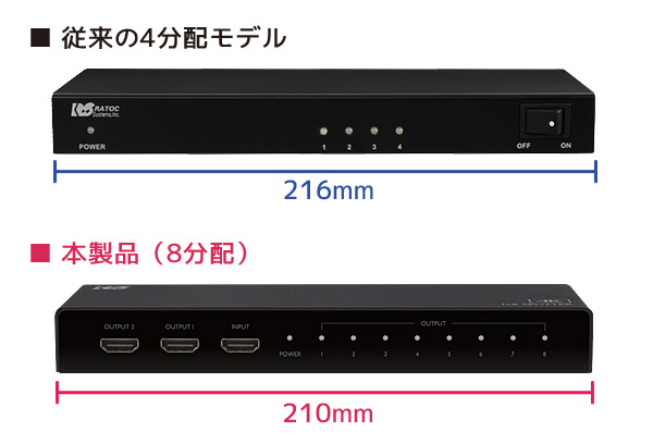 コンパクトサイズで持ち出しにも便利 本製品の筐体サイズは、約210×67×26mm(W×D×H)のコンパクトな設計。従来の4分配モデルのサイズ(約216(W)x85(D)x25(H)mm)よりも小さく、持ち出しにも便利です。 | ||||||||||||||||||||