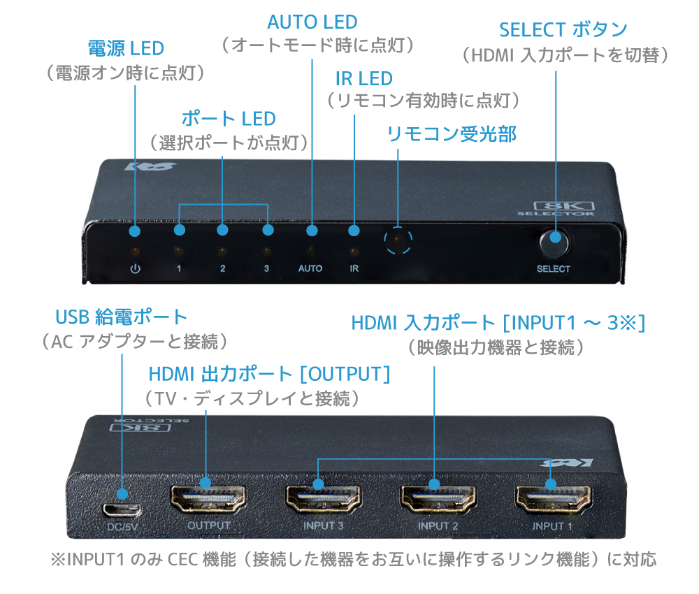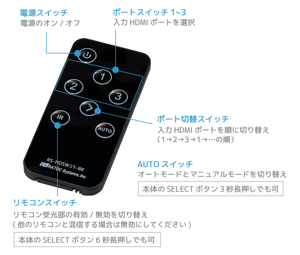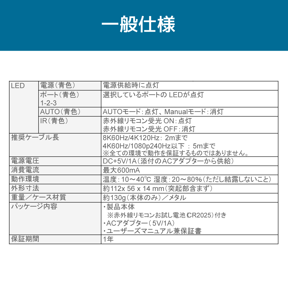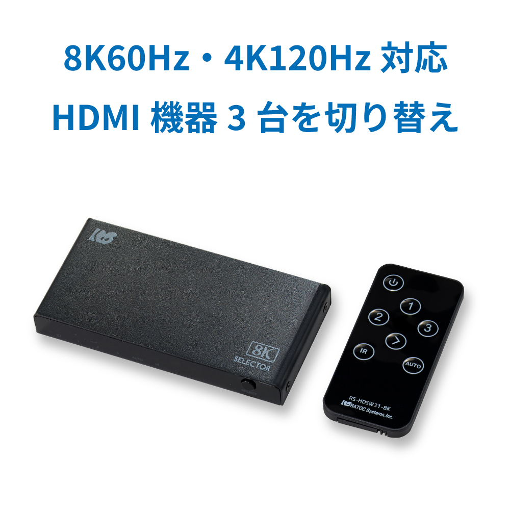2入力1出力(RS-HDSW21-8KA) 3入力1出力(RS-HDSW31-8KA)←本製品 4入力1出力(RS-HDSW41-8KA) 2入力1出力/1入力2出力(RS-BDHDSW21-8K) 4入力1出力-音声分離機能付(RS-HDSW41A-8K) 4入力1出力-TypeCポート搭載(RS-HDSW41C-8K) |