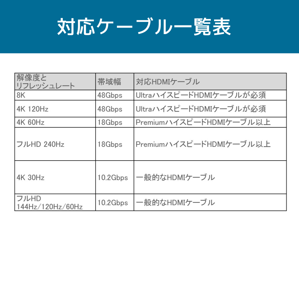 ●お願い● 本製品との8Kおよび4K120Hzでの接続には、UltraハイスピードHDMIケーブル(2m以内)を必ずご使用ください。ご使用の解像度/リフレッシュレートにあった適切なHDMIケーブルをご使用ください。 |