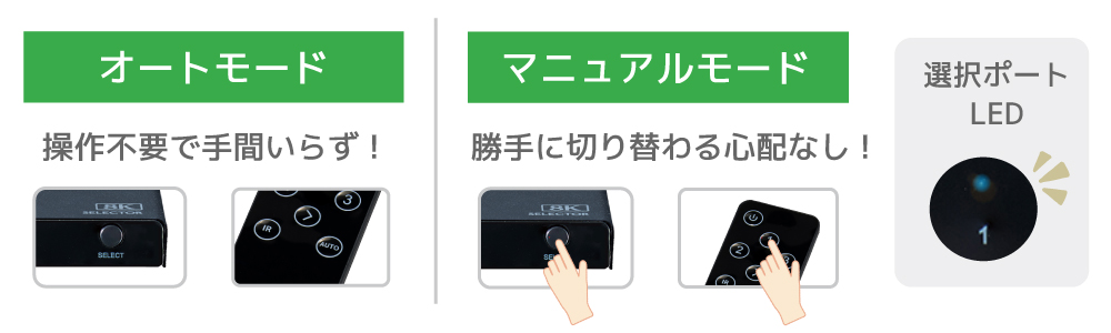 マニュアルモード 「本体のSELECT ボタン」「リモコンのポートスイッチ・ポート切替スイッチ」を押した際に入力ポートが切り替わるモードです。ゲームや映画の鑑賞中に録画が始まっても画面は切り替わらないため、大事な場面を逃しません。 |