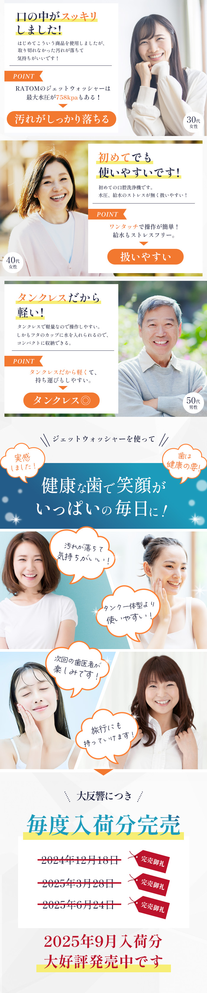 【洗練された一体型フォルム】 洗面台に置いても清潔化がありスマートな形です。必要な用品(本体、ノズル、充電ケーブル、給水チューブ)がスタンド内に収まり、スッキリ収納が可能です。【簡単モード変更】 弱・中・強の3段階の水圧変更だけでなく、電源入れる/切るの操作がボタン1つで操作可能です。【お風呂場の使用OK】 IPX7防水の設計のため、洗面台だけでなくお風呂場でも使用が可能です。入浴している間に口内ケアもできるので時短にもなります。※40度以上のお湯で給水はしないでください。【スッと置くだけ充電】スタンドにジェットウォッシャー本体を立てかけることにより充電が可能です。スタンド内に充電ケーブルが収納されているので、洗面台近くのコンセントを利用して充電いただけます。※充電アダプタは付属していません。【商品仕様/保証内容】本体サイズ(ノズル含まず):縦19.5cm*横6.3cm*奥行き4.2cm/重量:364g/充電式:USB充電/防水等級:IPX7/リチウム電池使用/最大水圧758kpa /対象年齢:3歳以上/保証:商品到着から30日間の満足保証付き