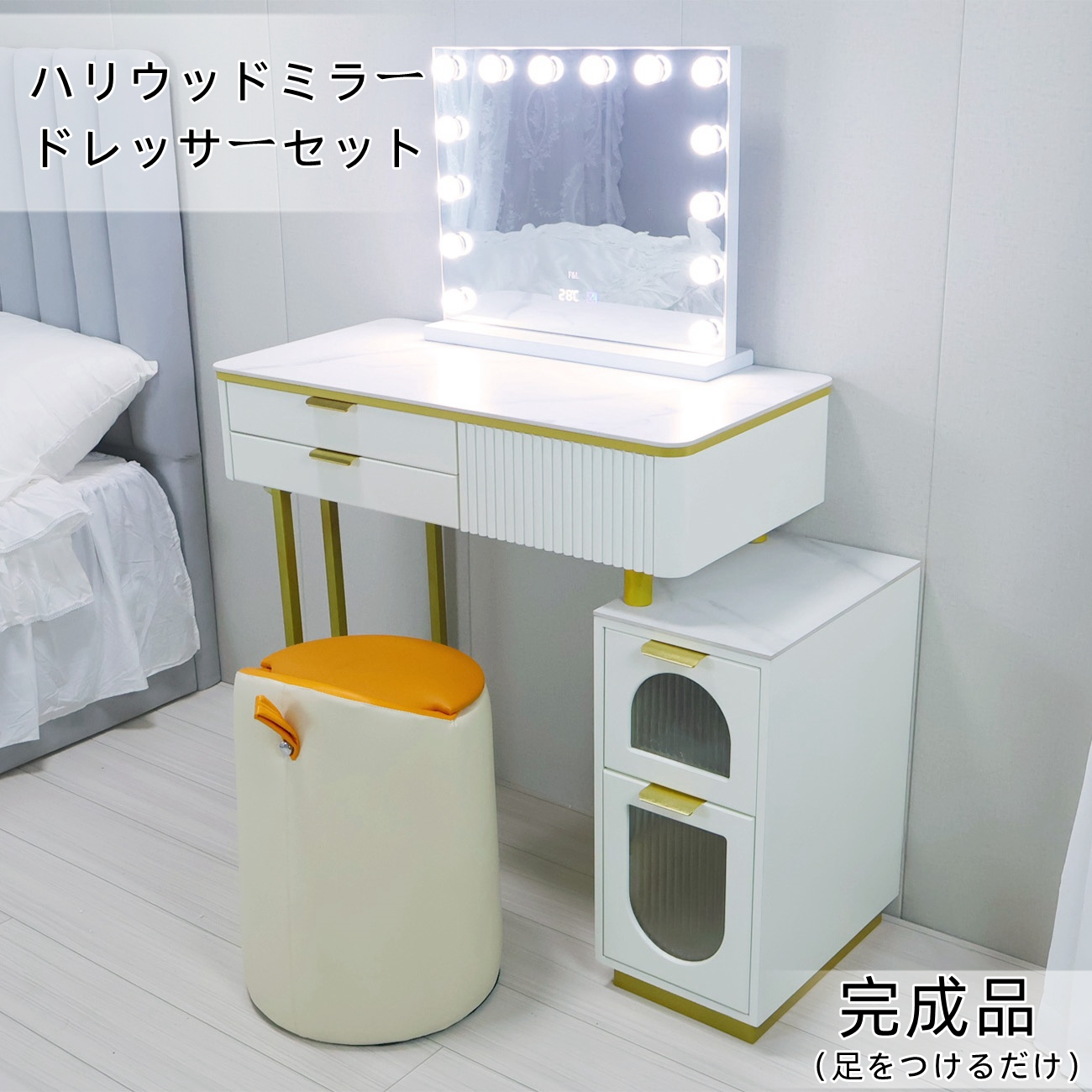 鏡台 ドレッサー おしゃれ 女優ミラー 北欧風 自社製品 オリジナルオーダー お姫系 大理石天板 テーブル幅80cm チェスト LEDミラー スツール 寝室スメ台 収納