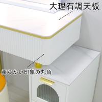 このドレッサーは、シンプルでありながら高級感を演出するデザインが特徴です。真白のカラーリングと大理石の天板が、どんなお部屋にも洗練された雰囲気をもたらします。LEDミラーは明るくクリアな映りで、化粧時の細部までしっかりと確認できます。また、テーブル幅80cm、100cmとコンパクトながらも、必要なコスメやアクセサリーを収納できるスペースが充実しており、整理整頓も簡単です。