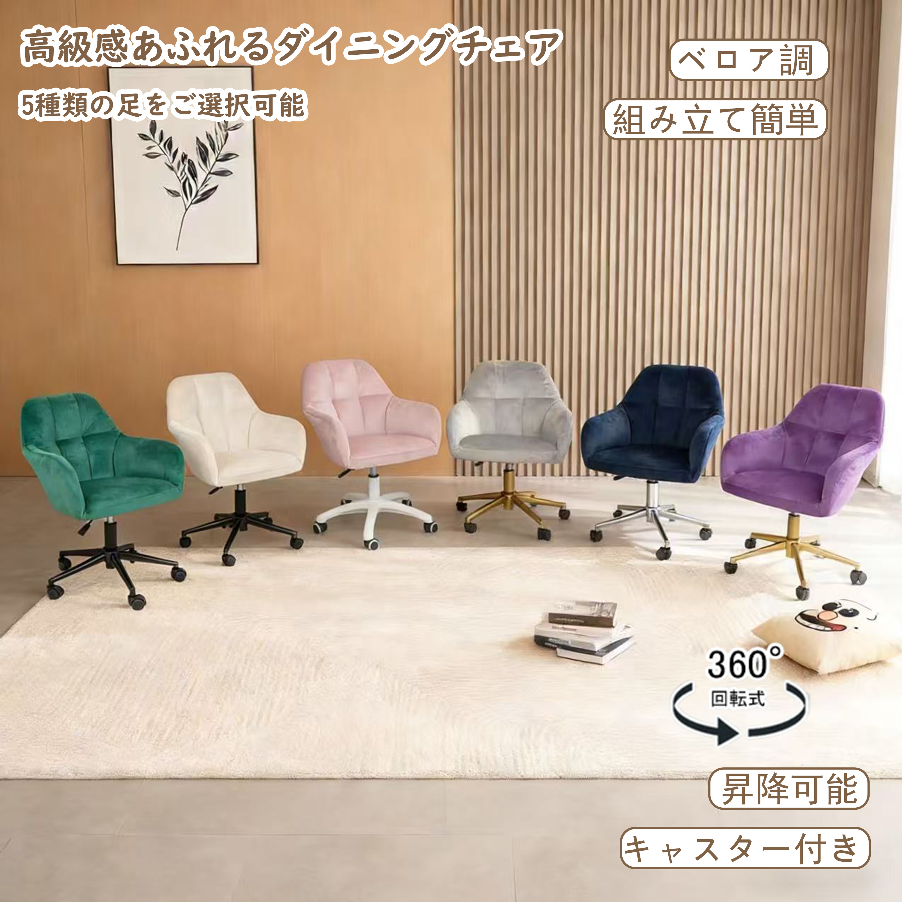 お部屋を彩るエレガントなダイニングチェア。このベロア素材の椅子は、そのふわふわとした座り心地と洗練されたデザインで、どんな空間も一層特別なものに変えてくれます。金色の脚部が加わることで、さらに高級感が増し、おしゃれなインテリアとしてもぴったりです。