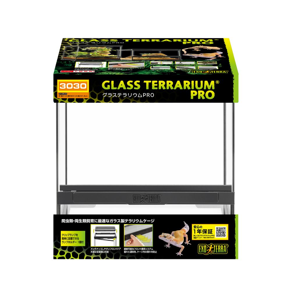 GEX エキゾテラ グラステラリウムPRO 3030 (品番PT4400)は、幅約31.0cm×奥行約31.0cm×高さ約32.0cmのガラス製爬虫類/両生類用ケージ。全面観察可能&天面全面開口のハイスペックモデル