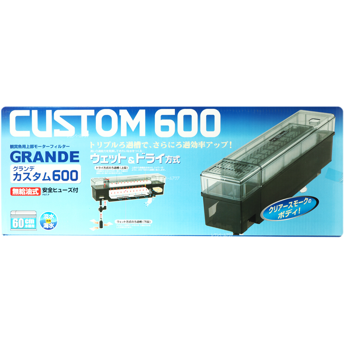 グランデカスタム600は、60cm水槽向けの強力なろ過システムです。上段からシャワーのように水を落とし、ドライ式とウェット式の両方でろ過能力を高めます。セットには本体やろ過材が含まれ、淡水・海水両用で設計されています。低消費電力で経済的な運用が可能です。