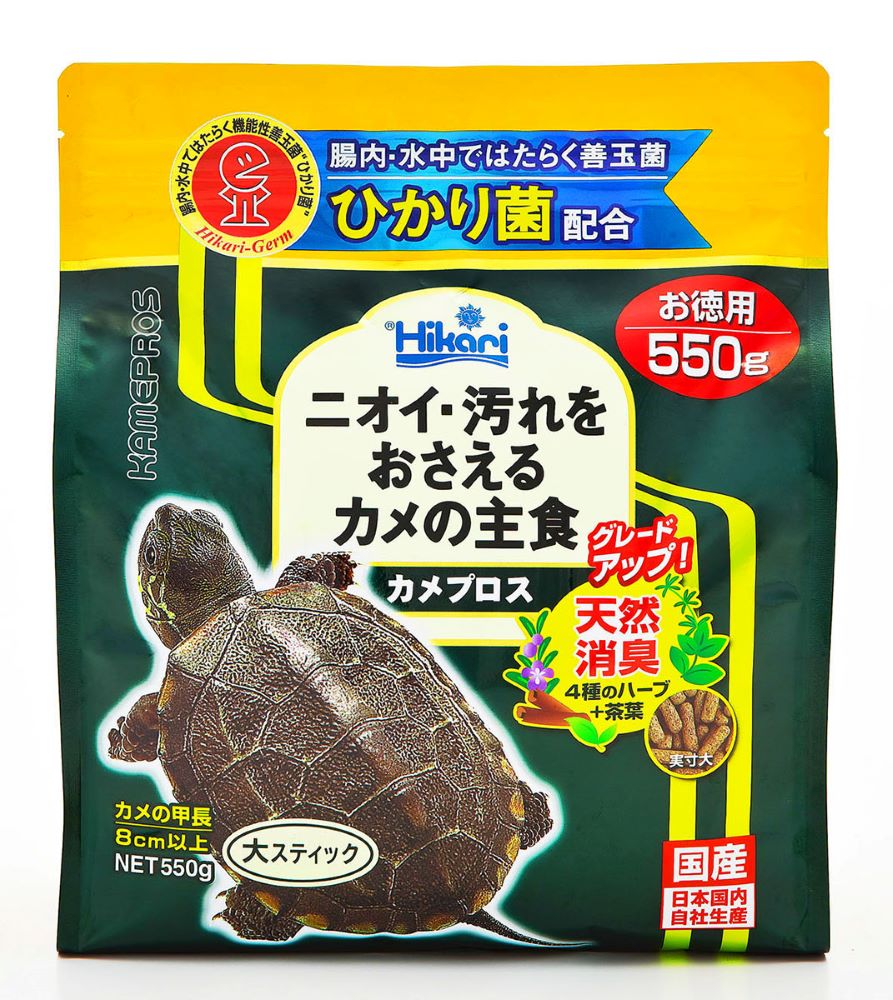 カメに最適な配合:甲羅の成長に必要なカルシウムとその吸収を助けるビタミンD3を強化配合。カメが必要とする栄養分を全て含んでいますので、カメプロスだけで飼育できます。