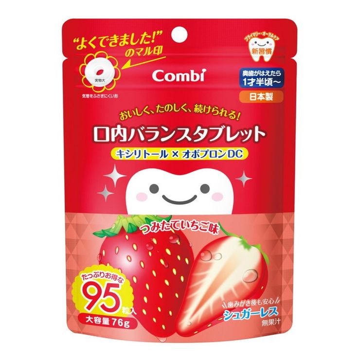 【発売元:コンビ】おいしく、たのしく続けられる!歯みがきを嫌がるお子さまや、妊娠中に歯みがきができないプレママの健康な口内環境づくりをサポート。ごほうびやおやつ代わりにも大活躍のタブレット!●プラーク(歯垢)にアプローチするオボプロンDCが配合された、おいしく楽しめるタブレットで、オーラルケアの新習慣を●お得な大容量95粒入り。!★オボプロンDCとは・・・口の中では、砂糖を原料にしてネバネバしたグルカンが作られ、歯にプラーク(歯垢)として付着します。オボプロンDCは、プラークにアプローチし、健康な口内環境づくりをサポート。また、安心安全に食べられる卵由来成分なので、口内ケアに理想的な食品素材です。個装サイズ:120X165X35mm個装重量:約83g内容量:76g(95粒)ケースサイズ:36.6X19.5X33.2cmケース重量:約3.7kg製造国:日本【名称】還元パラチノース含有加工食品【1才半頃〜(奥歯がはえたら)】【原材料】還元パラチノース(国内製造)、マルチトール、卵黄粉末(卵を含む)、イソマルトオリゴ糖/甘味料(キシリトール)、セルロース、ステアリン酸カルシウム、CMC-Na、香料【栄養成分表示(1袋(76g)当たり)】エネルギー・・・302.4kcaLたんぱく質・・・0.22g脂質・・・1.29g炭水化物・・・72.5g -糖類・・・0g食塩相当量・・・0.03g【お召し上がり方】・食後のおやつや、歯みがき後などに1日3粒程度を目安にお召し上がりください。・お子さまがまだ慣れないうちは、細かく砕いたり、小さく割ってからお与えください。・一度に多量に食べると、体質によってお腹がゆるくなることがあります。【注意】・お子さまには1才半頃、奥歯がはえるまでは食べさせないでください。また、のど詰まりを防ぐため、必ずそばに付き添い、食べおわるまで絶対に目を離さないでください。・食品によるアレルギーが認められている方は、原材料名をご確認ください。・お子さまの手の届かないところに保管してください。・体調や体質にあわない場合は使用を中止してください。・開封後はしっかりチャックを閉め、賞味期限にかかわらずお早めにお召し上がりください。・乾燥剤が入っていますので、お子さまが誤って口に入れないよう、ご注意ください。【保存方法】高温多湿、直射日光を避けて保管し、開封後はお早めにお召し上がりください。【賞味期限】パッケージに記載
