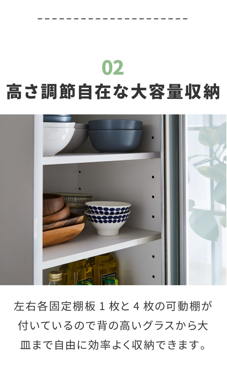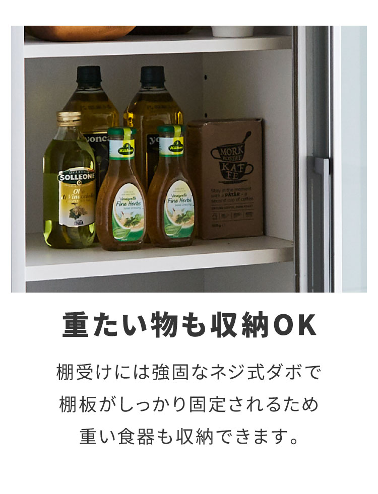 ネジ式ダボ: 棚板を支えるのは、通常の差し込み式ではなくネジ式のダボ。棚板がずれ落ちる心配がなく、重い食器も収納できます。
