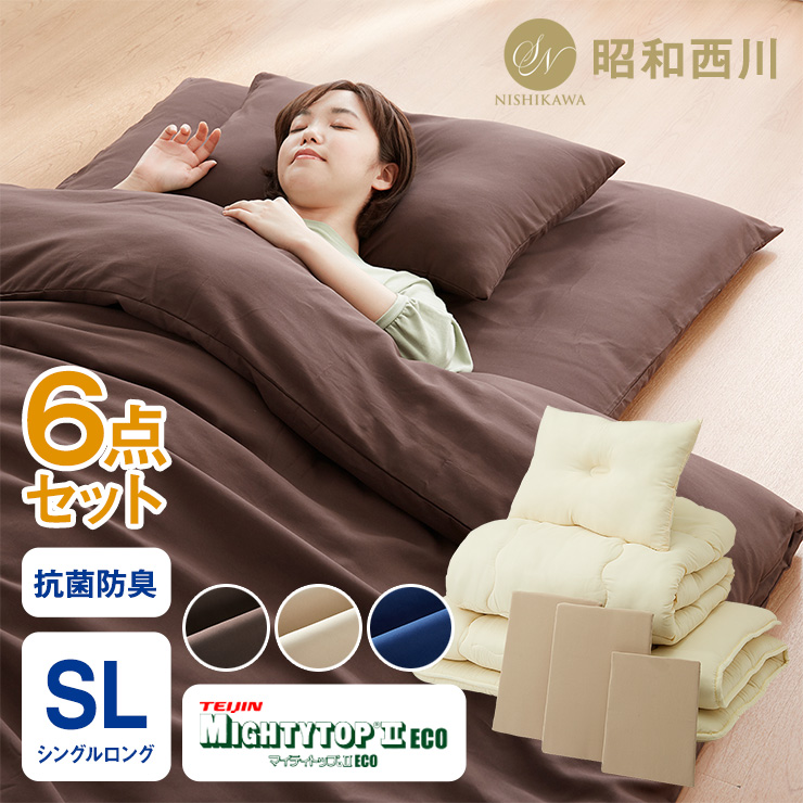 昭和西川 布団6点セット シングル テイジン製マイティトップ使用 洗える 抗菌防臭 防ダニ 固綿入り3層敷布団 頸椎安定型枕 カバー付 収納ケース付