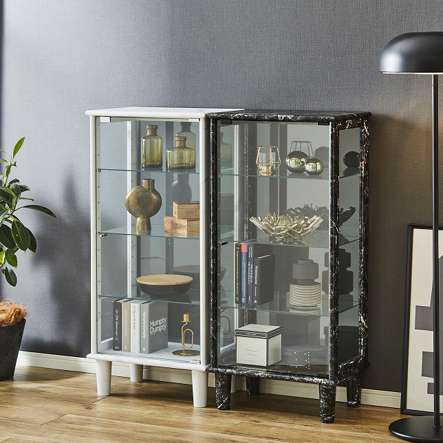 ・高さ調整ができる可動式のガラス棚。飾るものに合わせて自由なレイアウトが楽しめます。