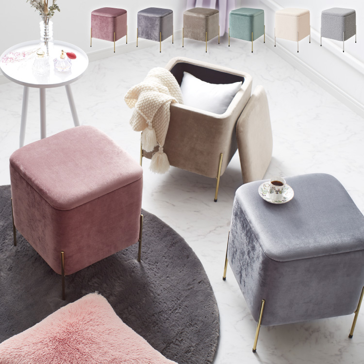 スツール 収納 おしゃれ ベルベッド ベロア くすみカラー 30×30cm 正方形 ゴールド 脚付き リビング ドレッサー 玄関 椅子 イス チェア オットマン