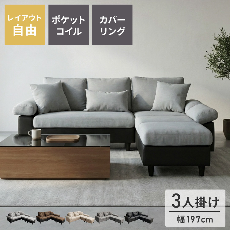 カバーリング ソファ 3人掛け 洗える L字型 幅197 クッション オットマン コーナーソファ ポケットコイル 天然木 大きめ おしゃれ 北欧 レザー 代引不可