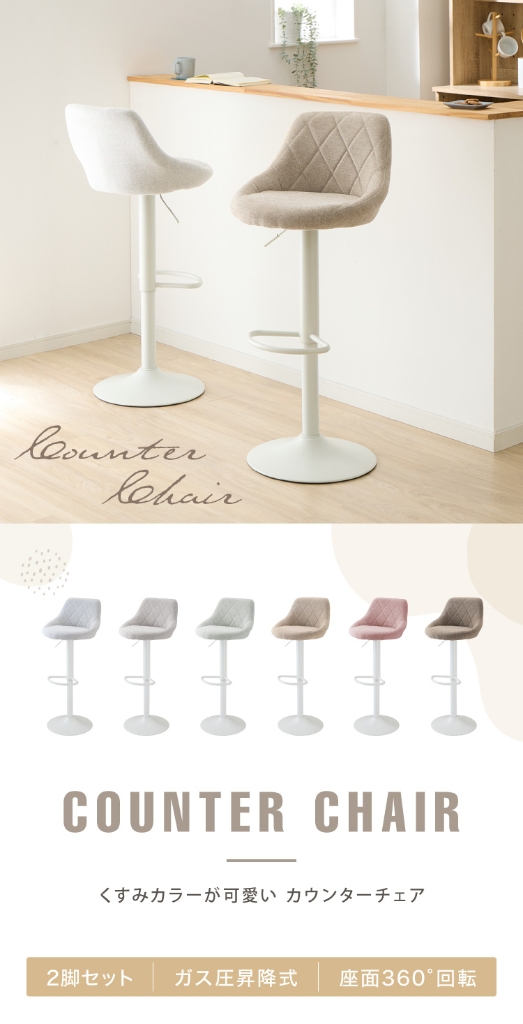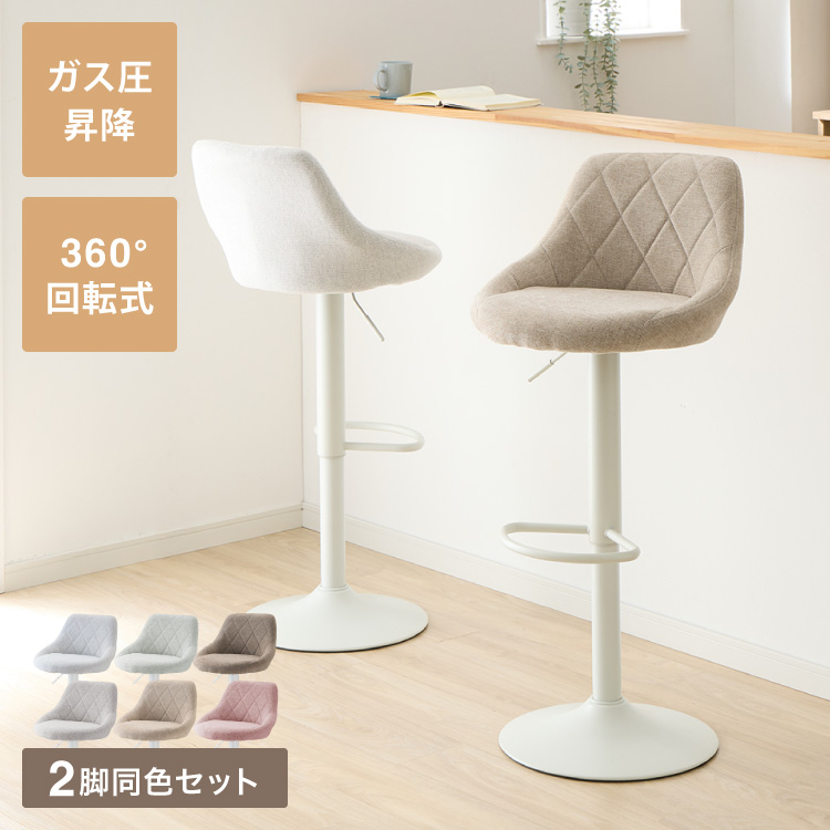 カウンターチェア 背もたれ付き 2脚 セット 昇降 昇降式 360°回転 ファブリック カフェ カウンター おしゃれ バーチェア チェアー ダイニングチェア