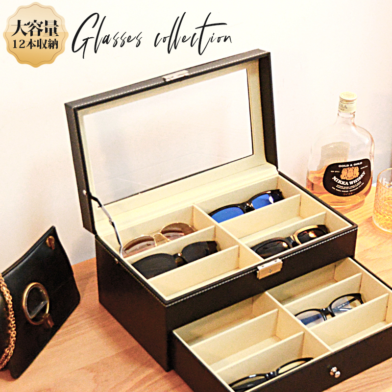 メガネケース おしゃれ 12本 メガネ収納ケース 12本入り レザー調 2段 引き出し 大容量 ガラス天窓 北欧 収納ケース 眼鏡ケース メガネボックス