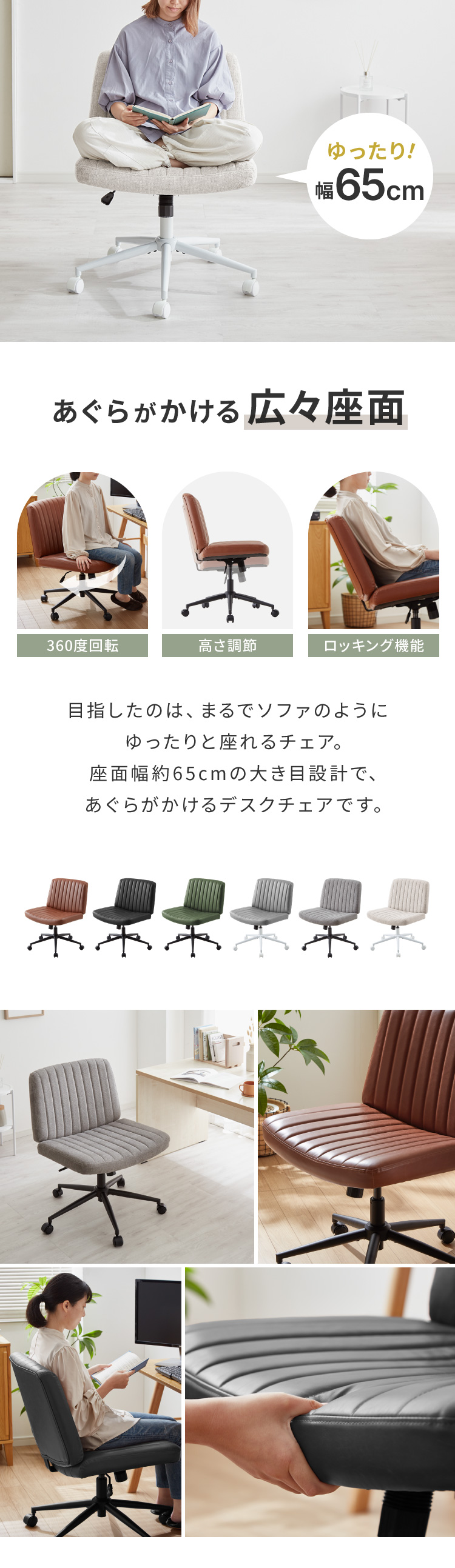 あぐらチェア 座面広々65cm ゆったり設計 高さ調節 昇降 キャスター付き ロッキング あぐら デスクチェア オフィスチェア ゲーミング チェア