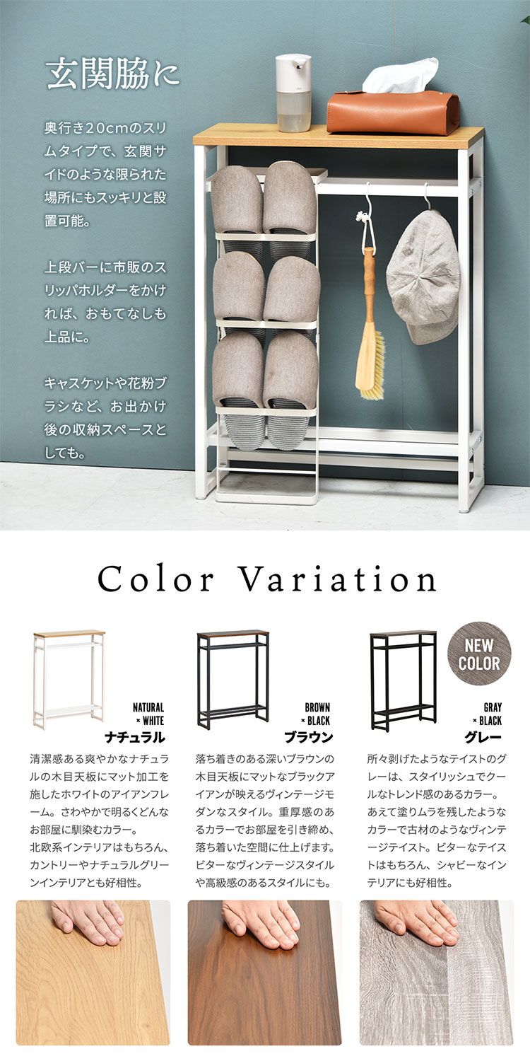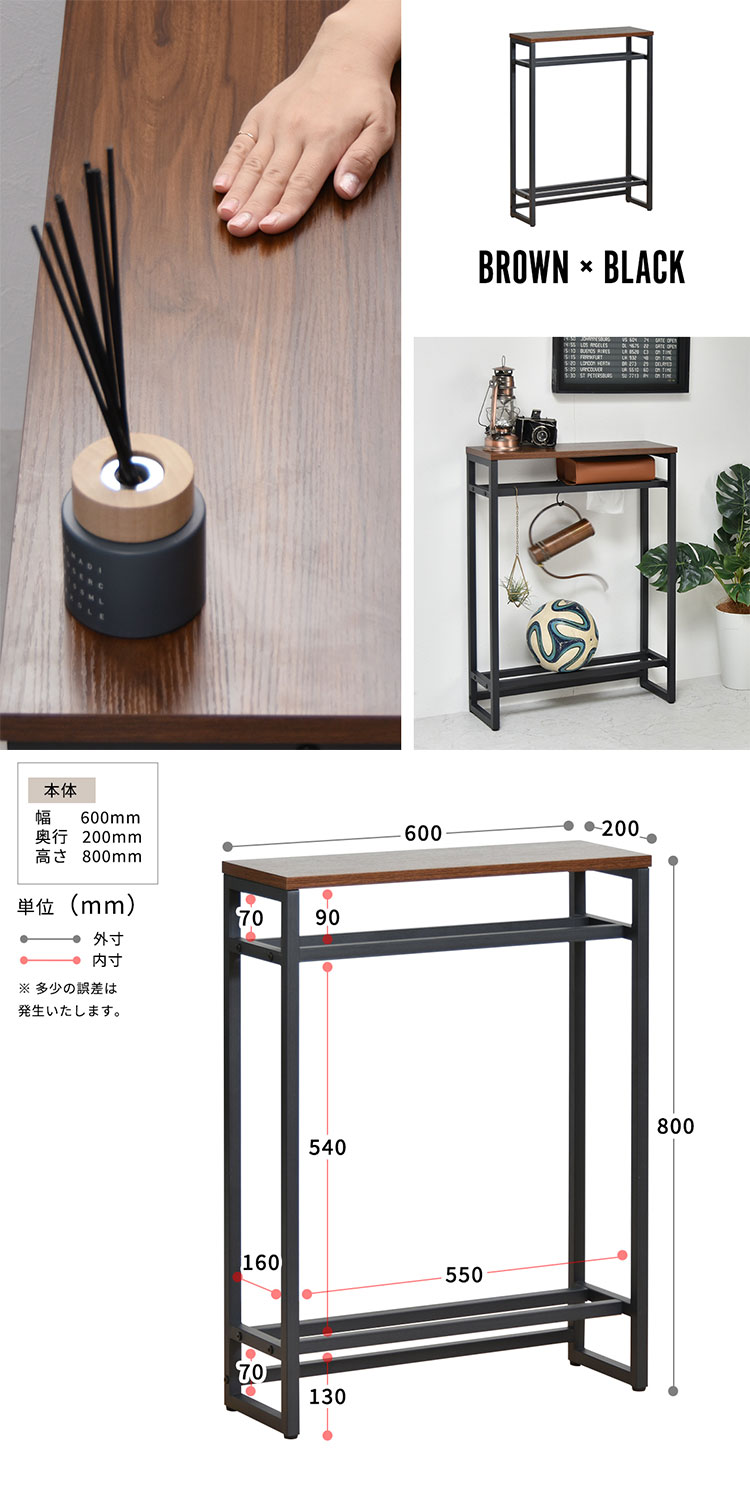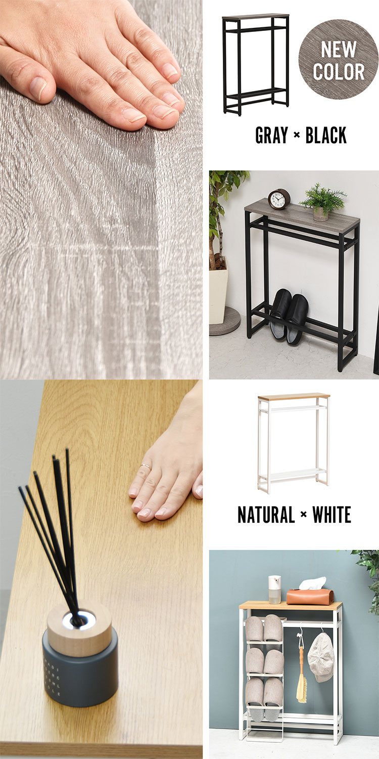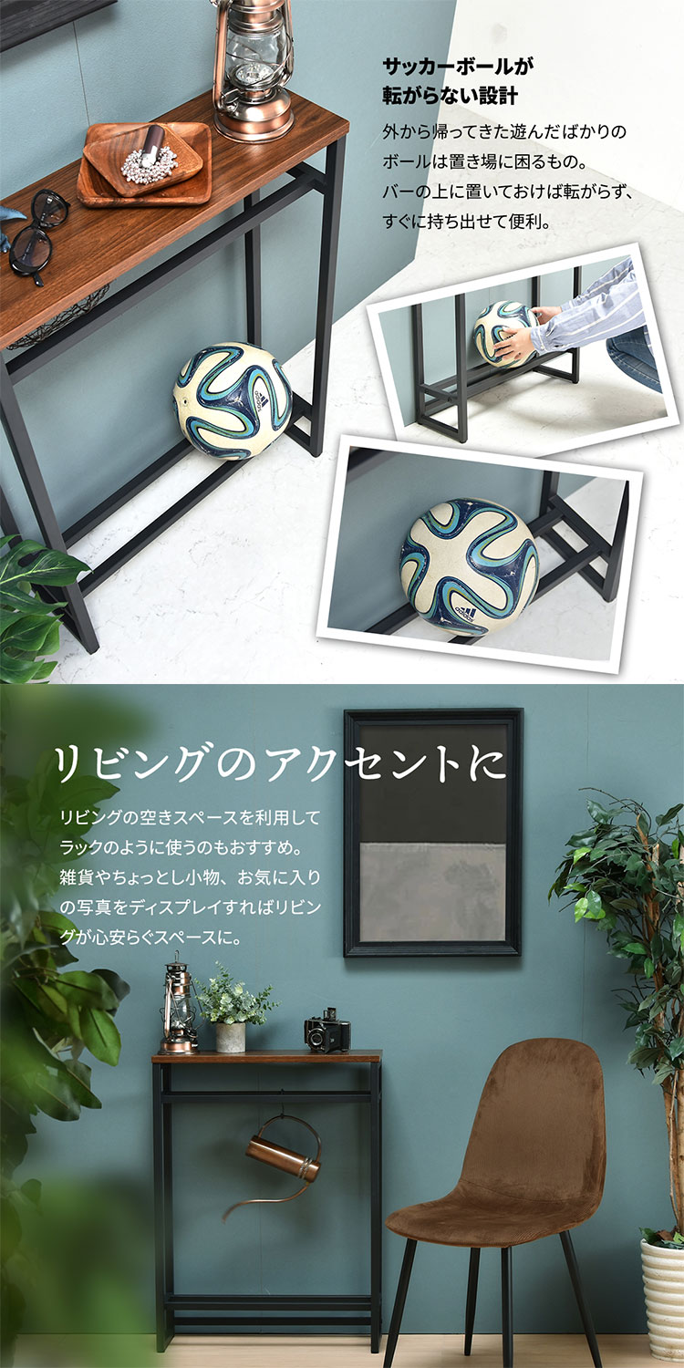 ■エントランスや廊下、リビングで大活躍。廊下やリビングでの観葉植物や鍵などの置き場としても活躍。ちょっとした置き場所が欲しい時に便利なコンソールテーブルです。上下に2本のバーがあるので小物や傘の収納、ボールやスリッパの収納に。