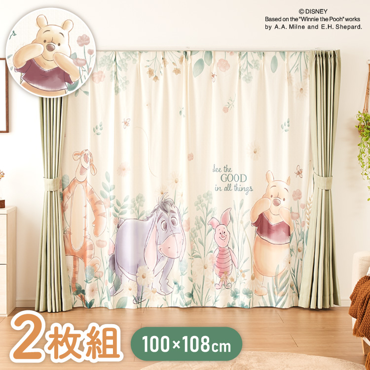 プーさん絵羽レースカーテン 2枚組 100×108cm UVカット 洗える 洗濯 プライバシー 目隠し フック付き カーテン 紫外線 おしゃれ かわいい 代引不可