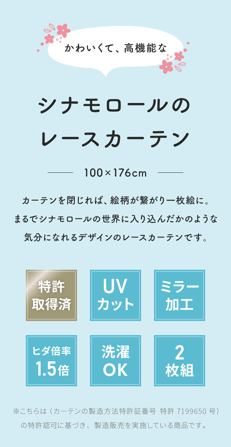 シナモン絵羽レースカーテン 2枚組 100×176cm UVカット 洗える 洗濯 プライバシー 目隠し フック付き カーテン 紫外線 おしゃれ かわいい サンリオ 代引不可