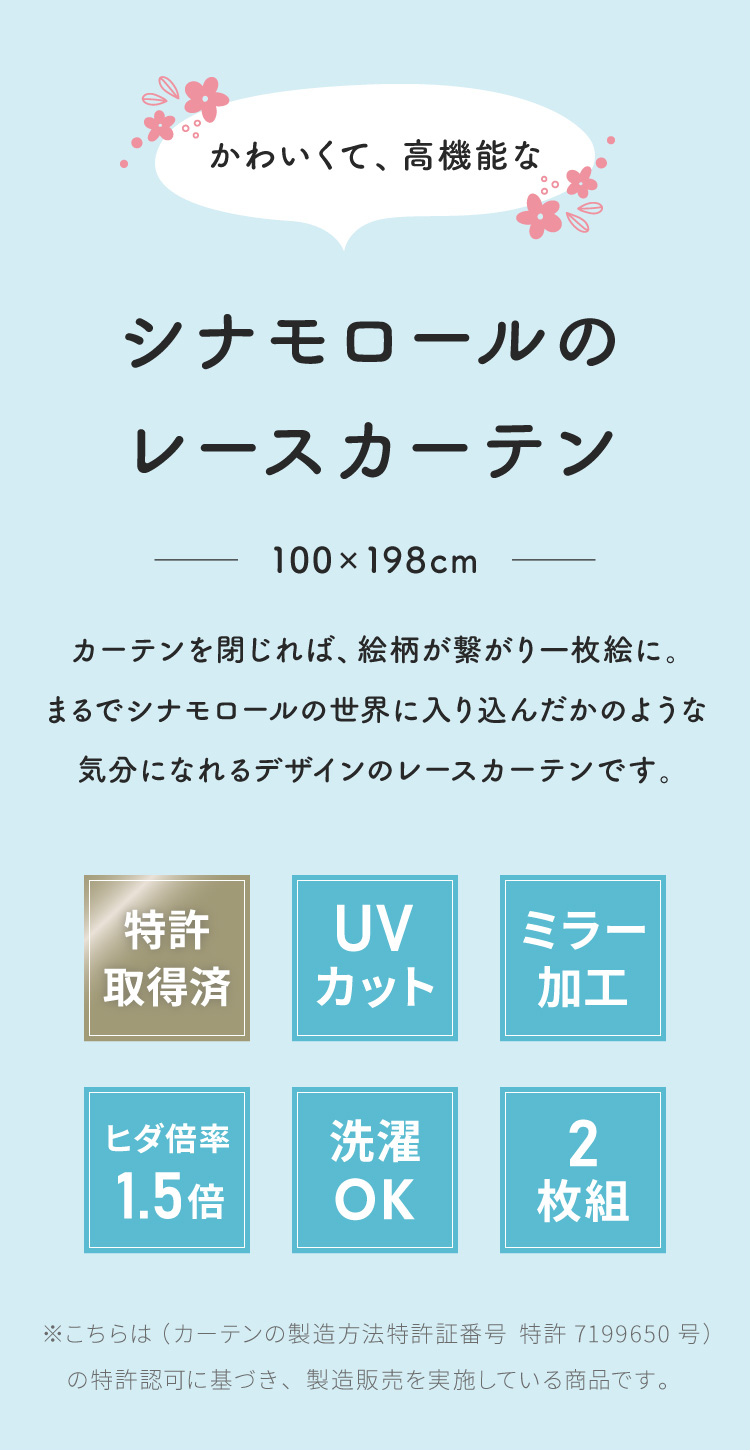 シナモン絵羽レースカーテン 2枚組 100×198cm UVカット 洗える 洗濯 プライバシー 目隠し フック付き カーテン 紫外線 おしゃれ かわいい サンリオ 代引不可