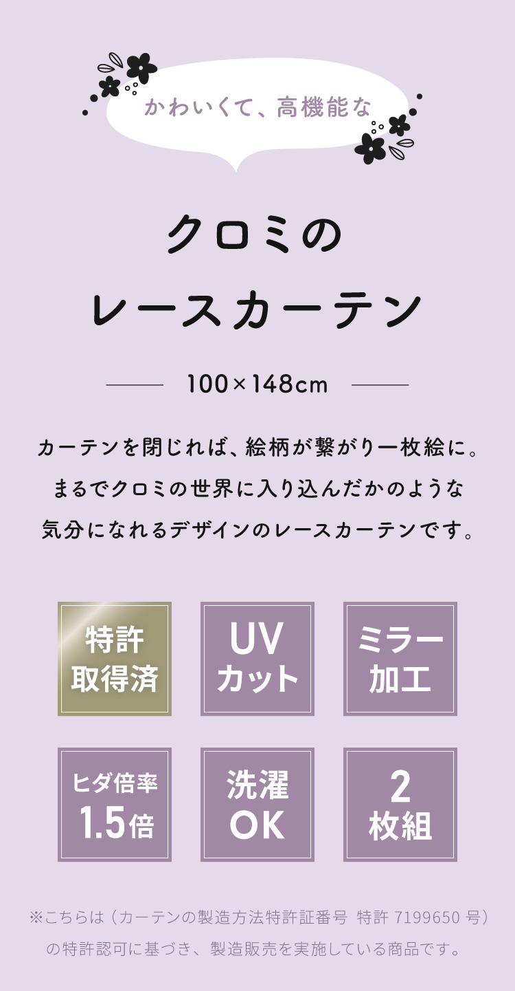 クロミ絵羽レースカーテン 2枚組 100×148cm UVカット 洗える 洗濯 プライバシー 目隠し フック付き カーテン 紫外線 おしゃれ かわいい サンリオ 代引不可