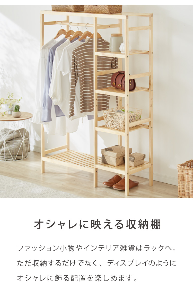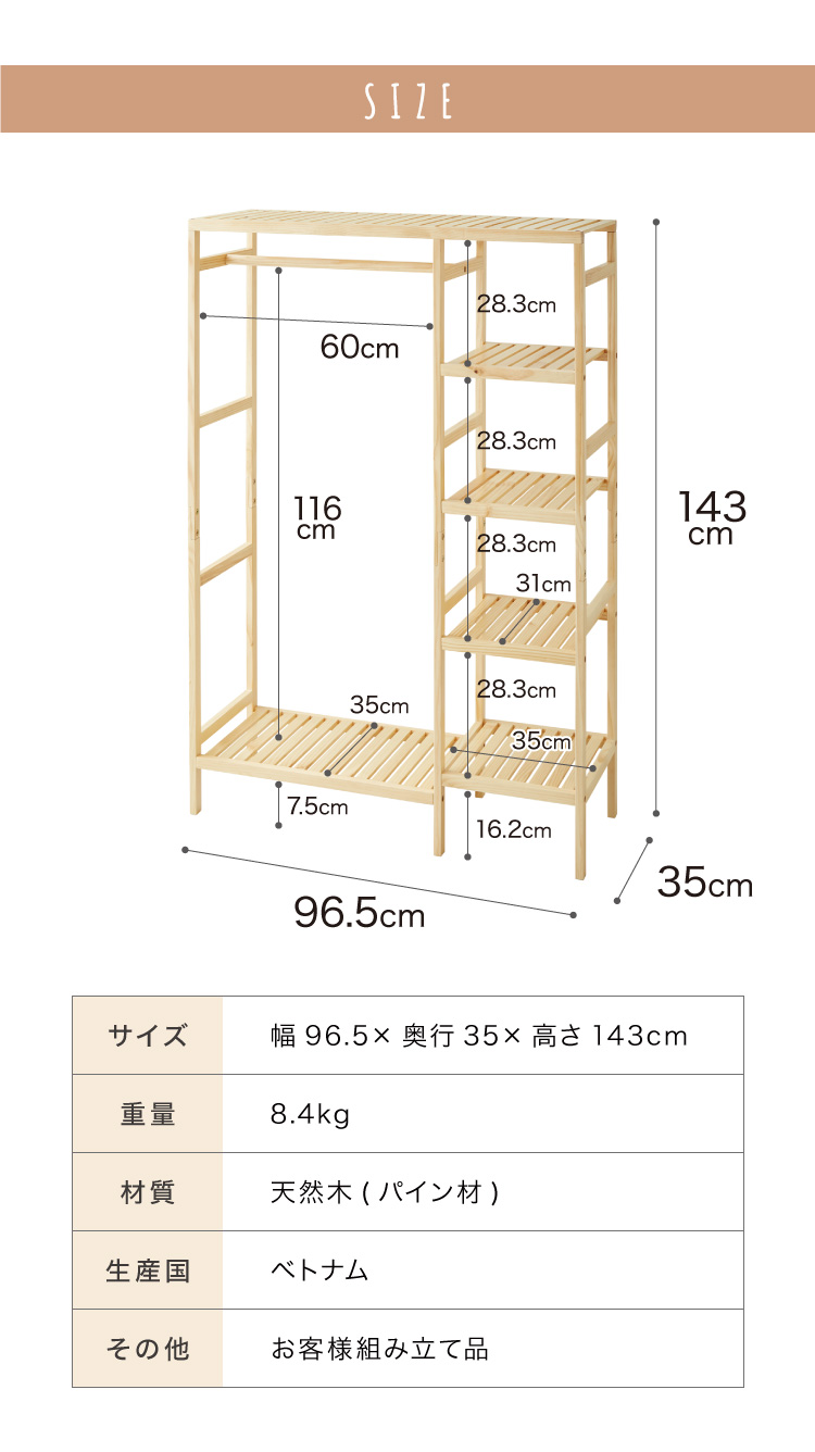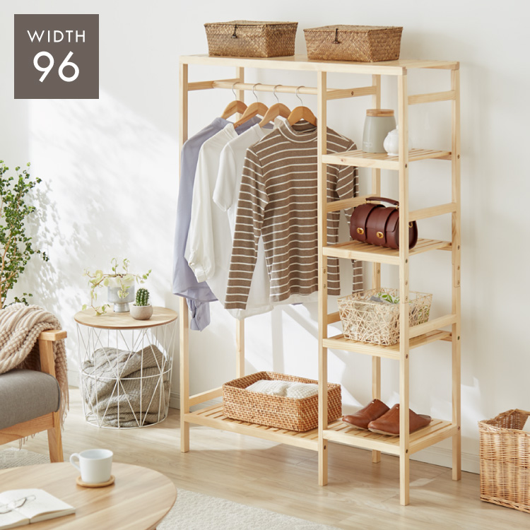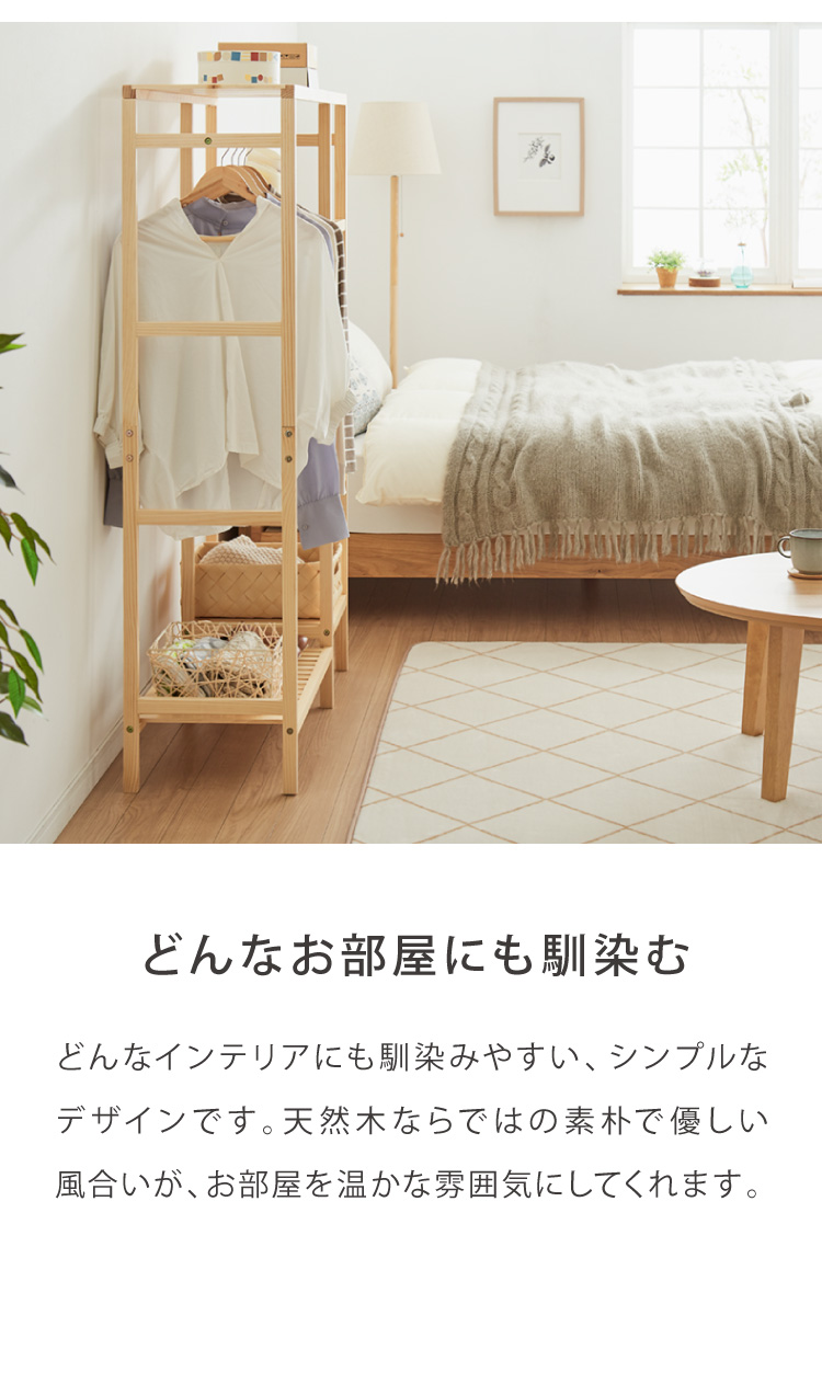 天然木棚付きハンガーラック 幅96.5cm 奥行35cm 高さ143cm ハンガーラック おしゃれ 棚付き 組立式 天然木 パイン材 シンプル コートハンガー