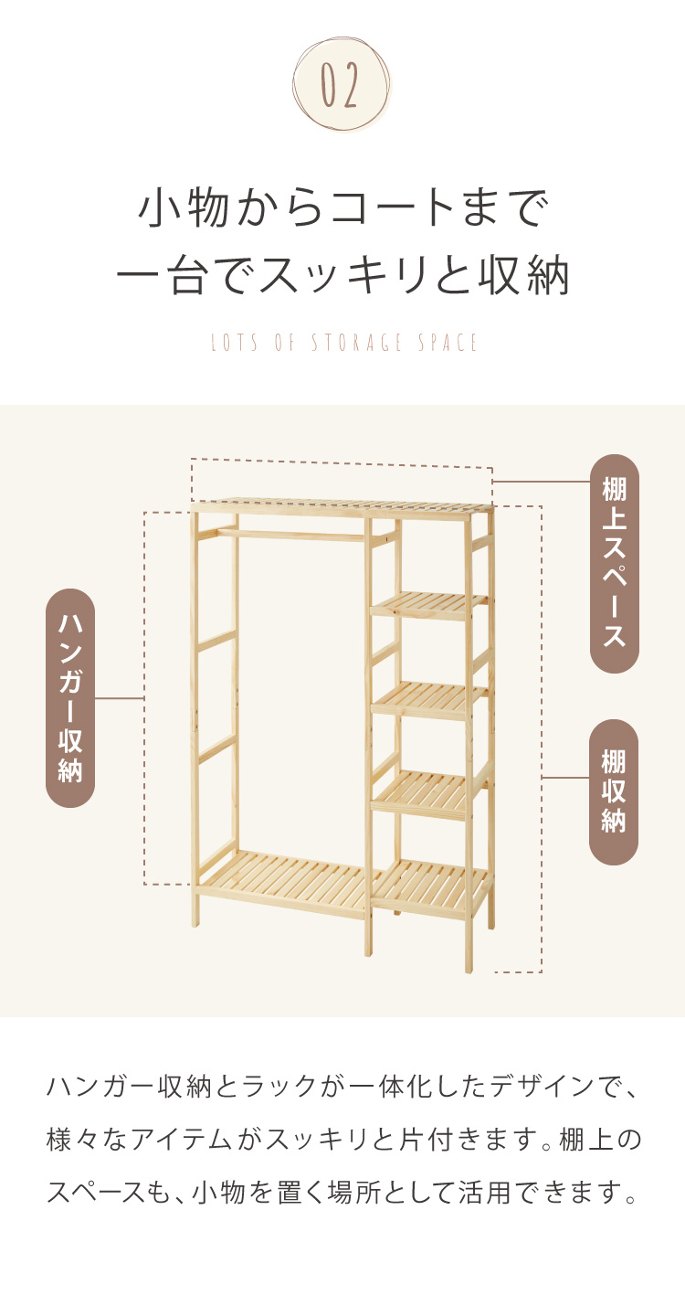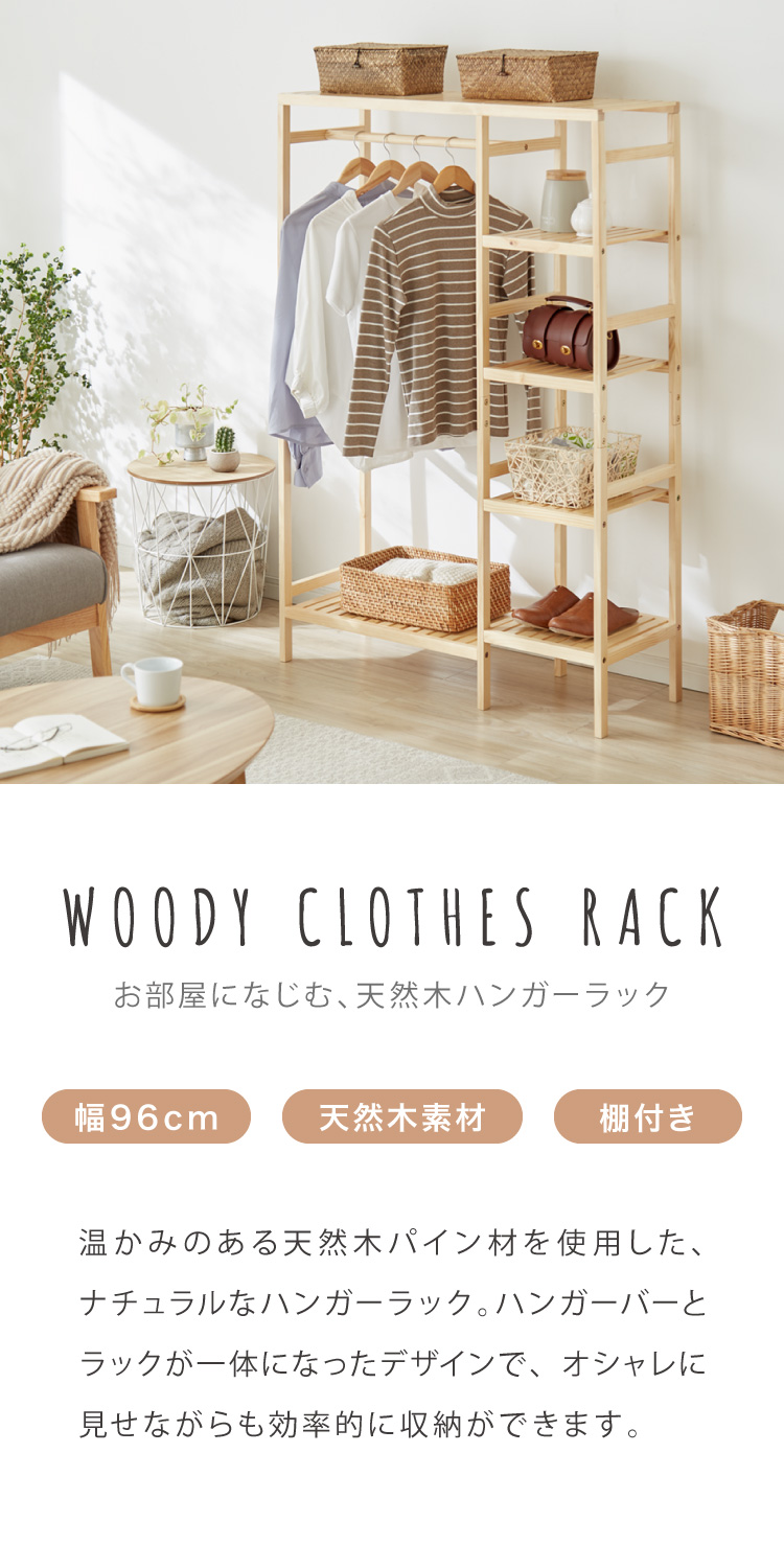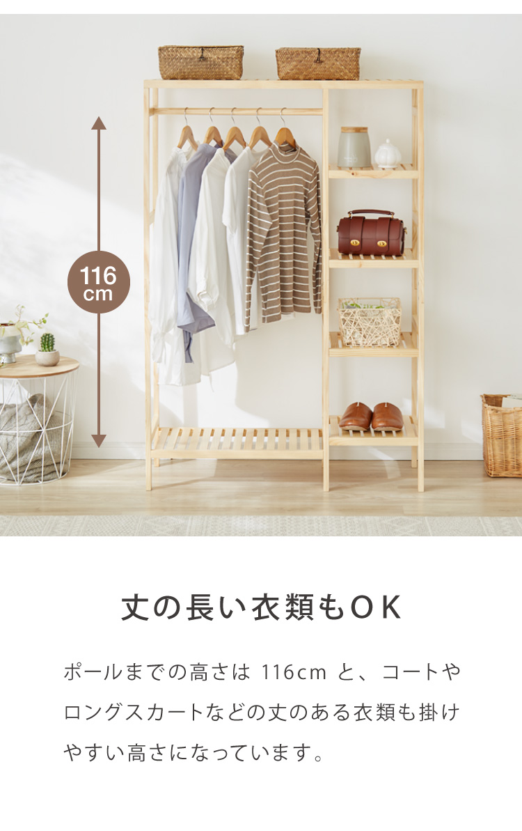 天然木棚付きハンガーラック 幅96.5cm 奥行35cm 高さ143cm ハンガーラック おしゃれ 棚付き 組立式 天然木 パイン材 シンプル コートハンガー