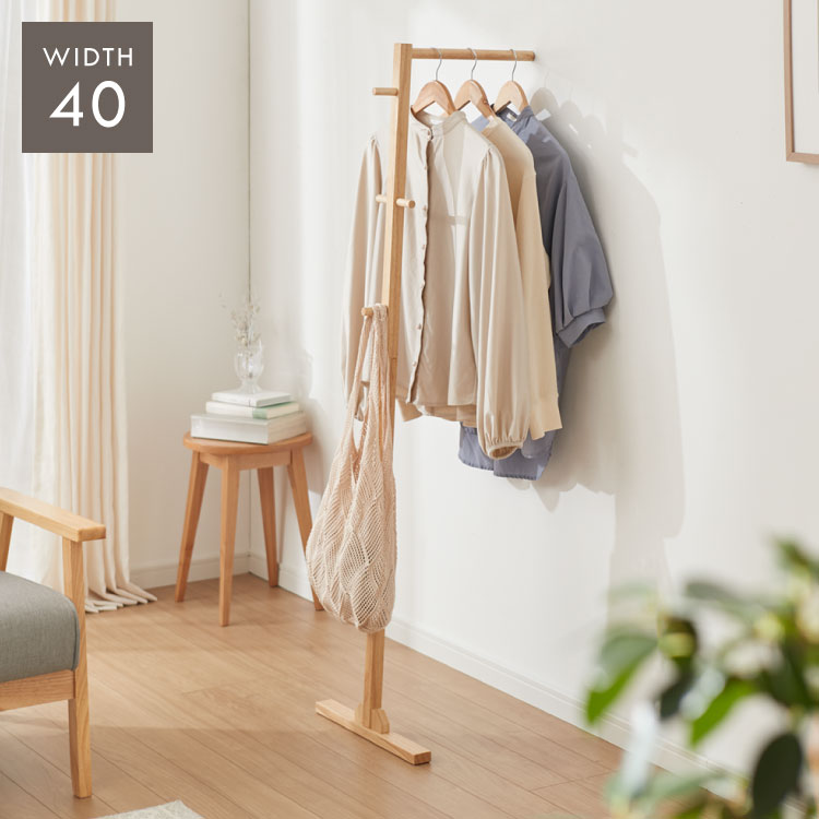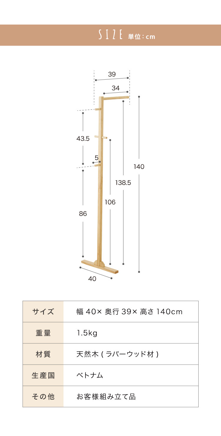 スタンドハンガー 幅40cm 奥行39cm 高さ140cm ハンガーラック おしゃれ 組立式 天然木 ラバーウッド材 シンプル コートハンガー 衣類収納 洋服掛け