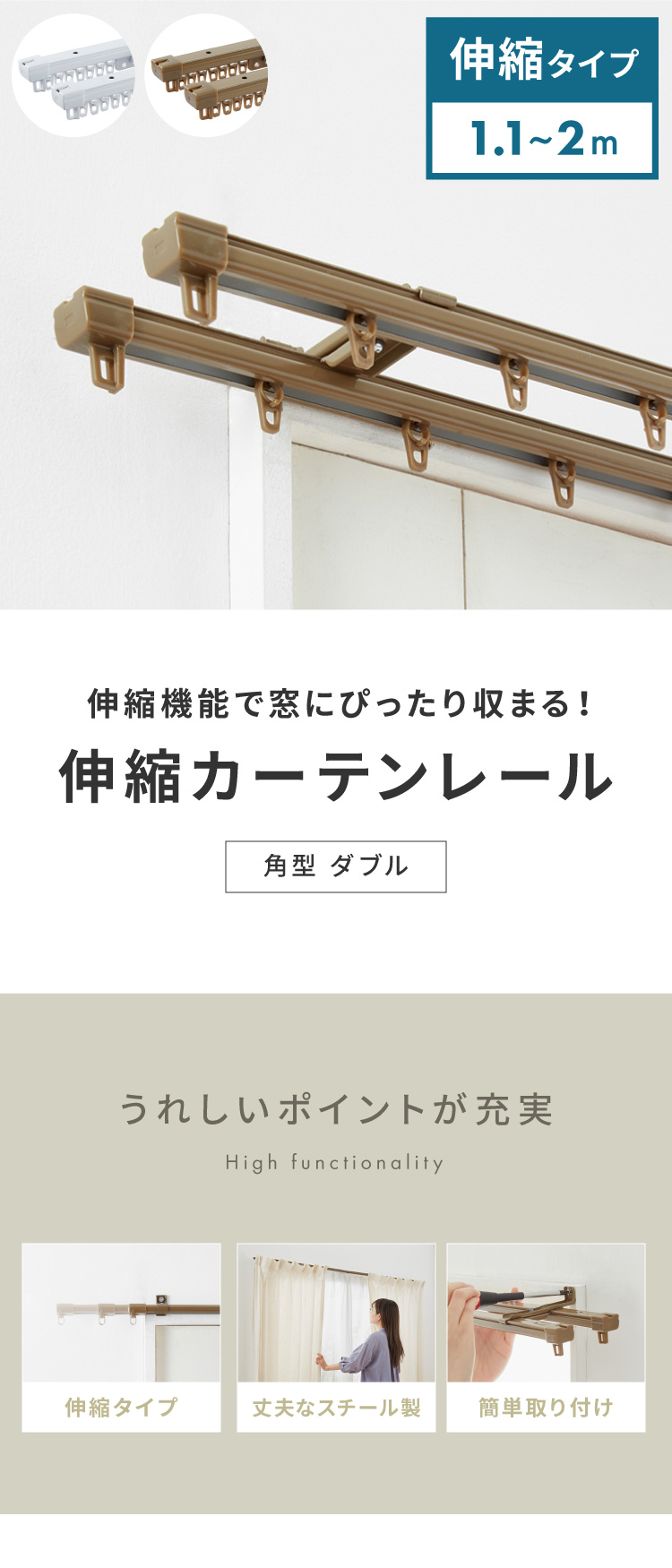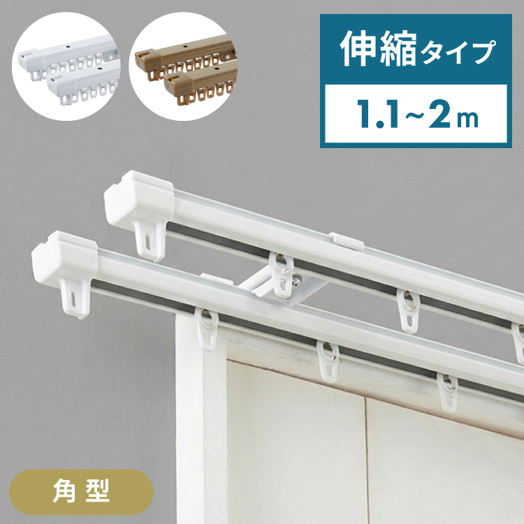 角型 カーテンレール ダブル 1.1~2m 伸縮カーテンレール 2.0m 伸縮 スチール製 天井付け 正面付け 取付簡単 伸長式 窓回り カーテン 賃貸 一人暮らし 代引不可