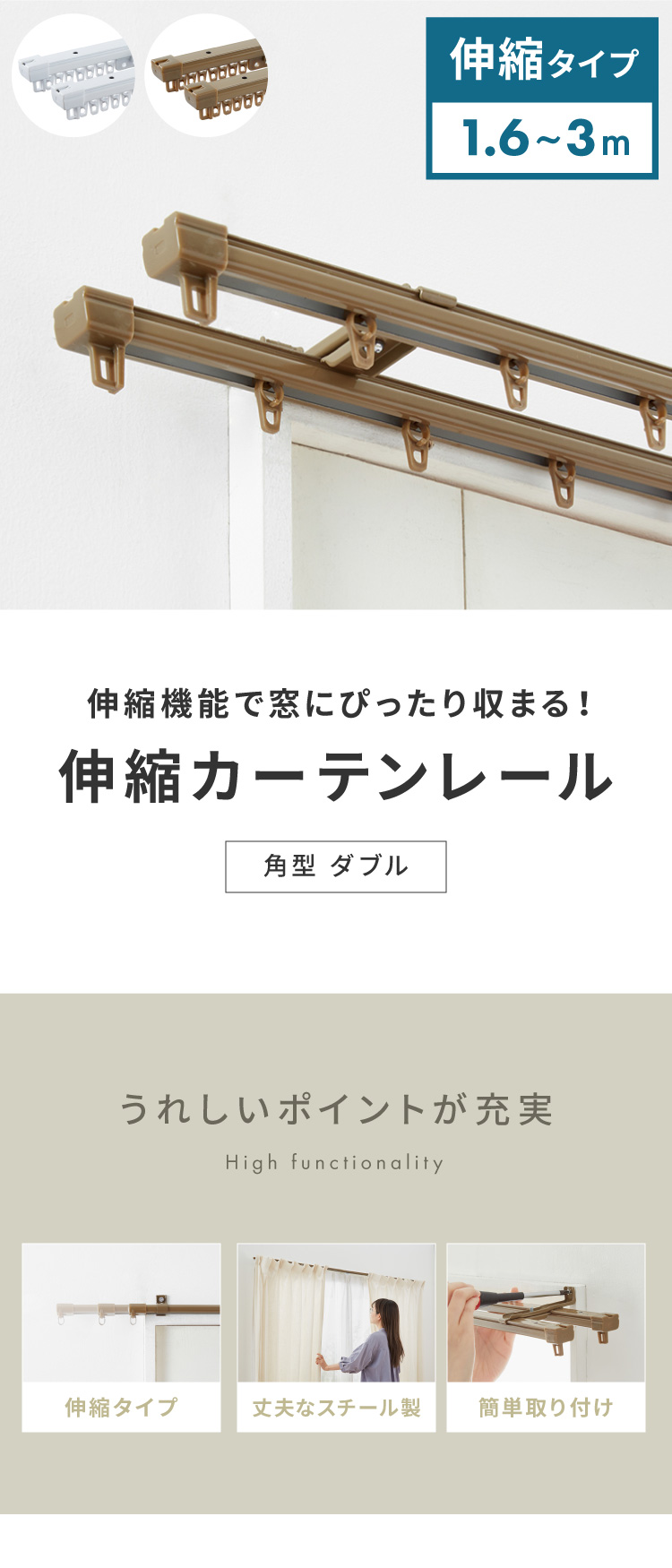 角型 カーテンレール ダブル 1.6~3m 伸縮カーテンレール 3.0m 伸縮 スチール製 天井付け 正面付け 取付簡単 伸長式 窓回り カーテン 賃貸 一人暮らし 代引不可