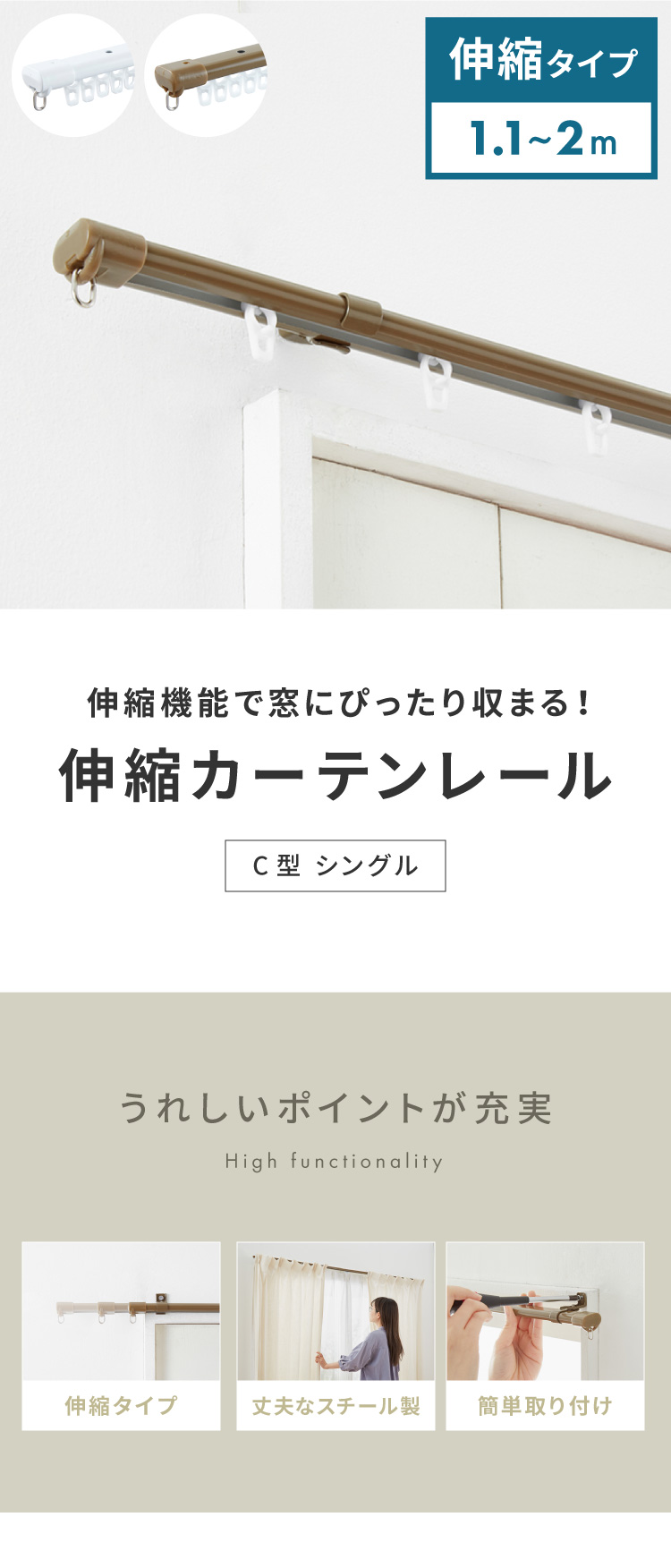 C型 カーテンレール シングル 1.1~2m 伸縮カーテンレール 2.0m 伸縮 スチール製 天井付け 正面付け 取付簡単 伸長式 窓回り カーテン 賃貸 代引不可