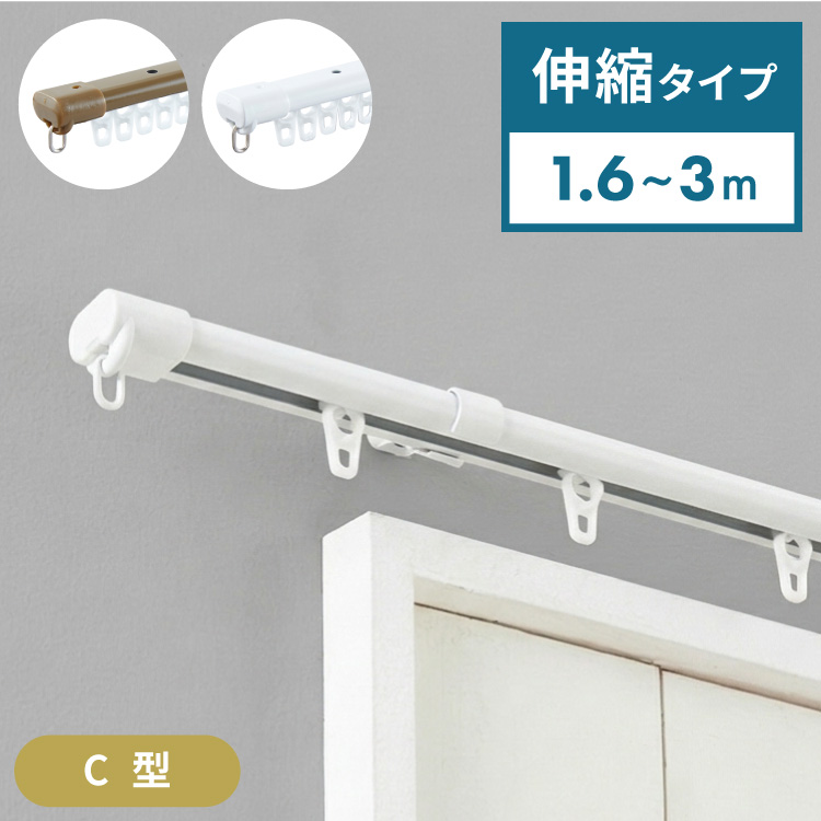 C型 カーテンレール シングル 1.6~3m 伸縮カーテンレール 3.0m 伸縮 スチール製 天井付け 正面付け 取付簡単 伸長式 窓回り カーテン 賃貸 代引不可