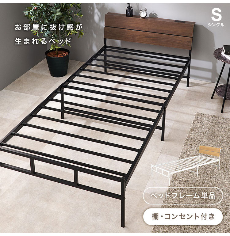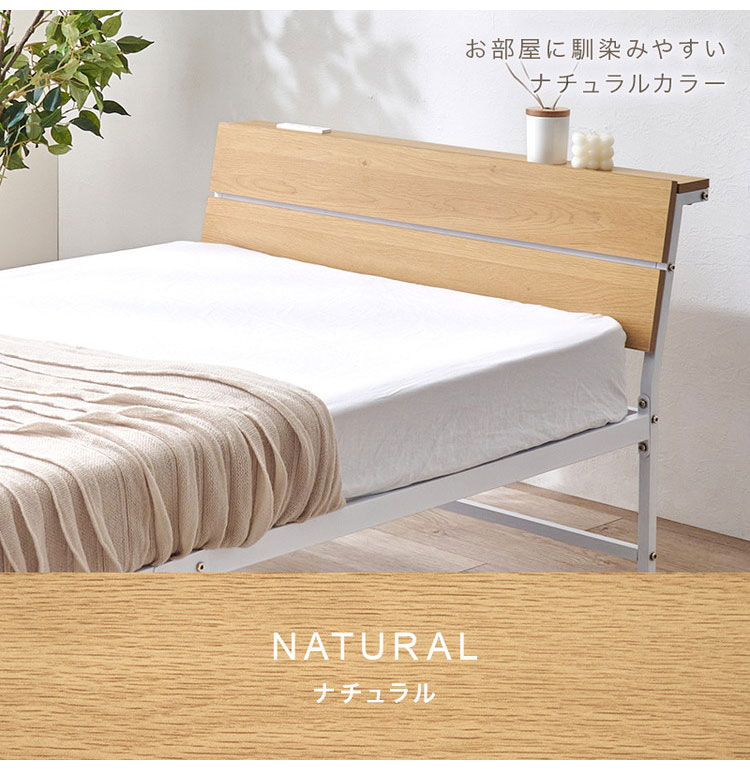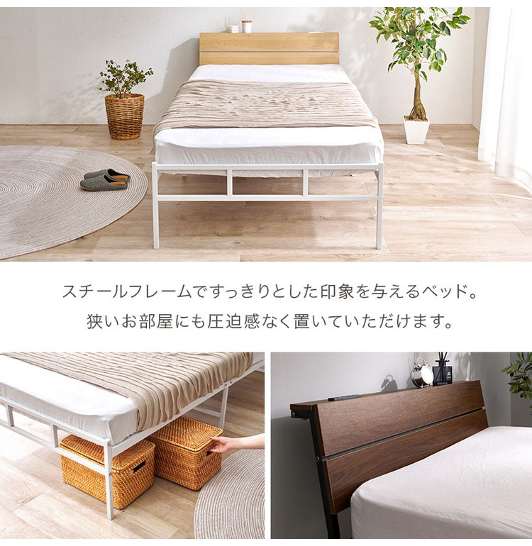 スチールフレームでスッキリとした印象のシングルベッド。ヘッドボードは木目調の傾斜があるパネル仕様です。便利な2口コンセント付き