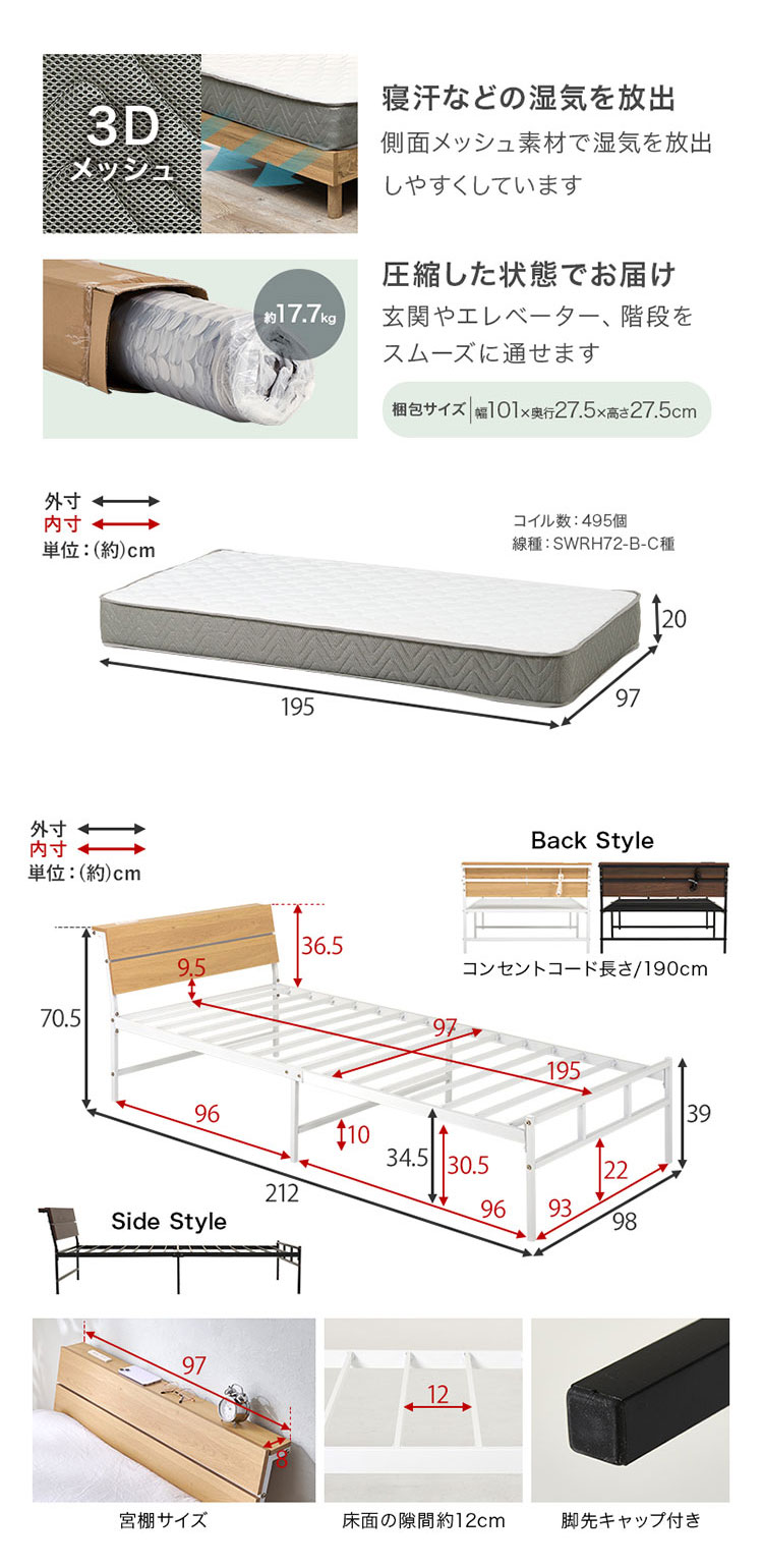 ベッド:(約)幅98×奥行212×高さ70.5×座面高34.5cm,マットレス:(約)幅97×奥行195×高さ20cm