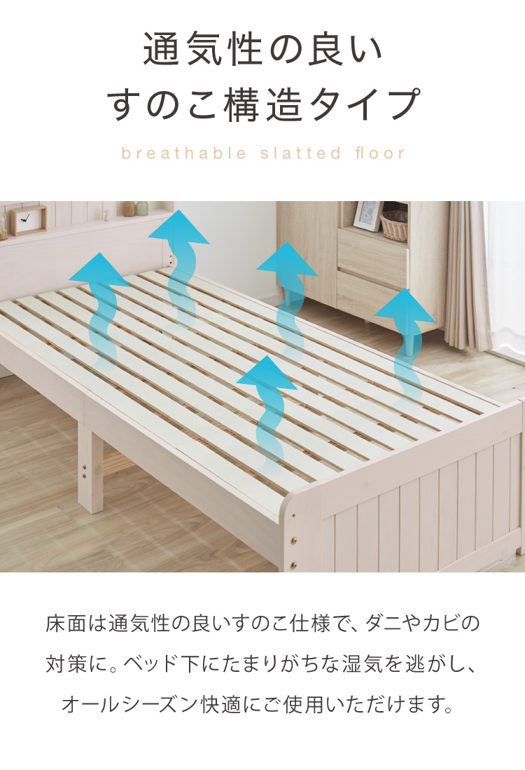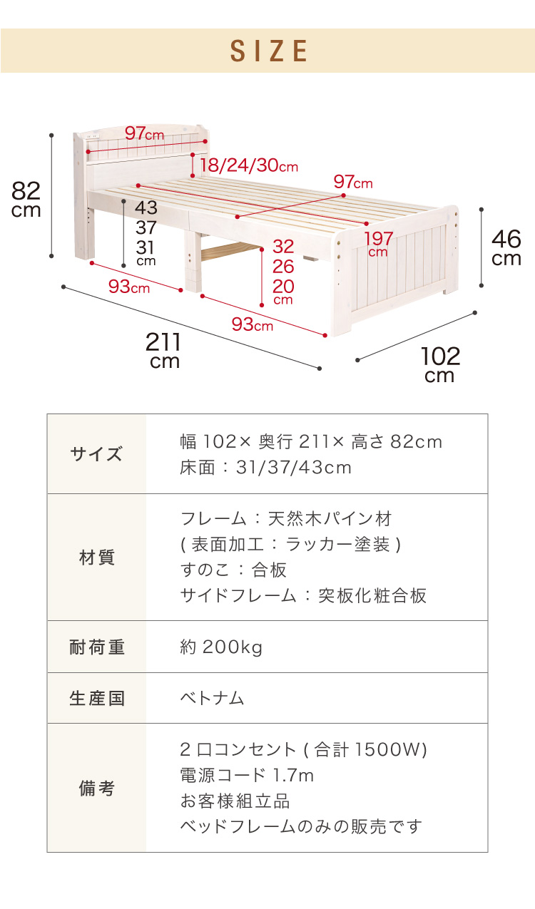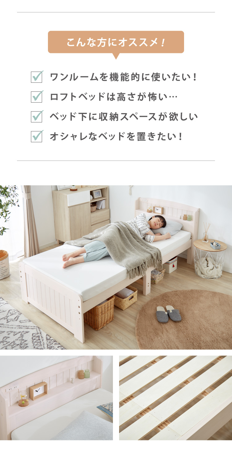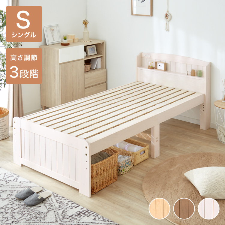 高さ3段階 カントリー調 すのこベッド シングル 棚コンセント付き 耐荷重200kg 天然木 ベッドフレーム 棚付き 宮棚付き 宮付き 敷布団OK パイン材 白 代引不可