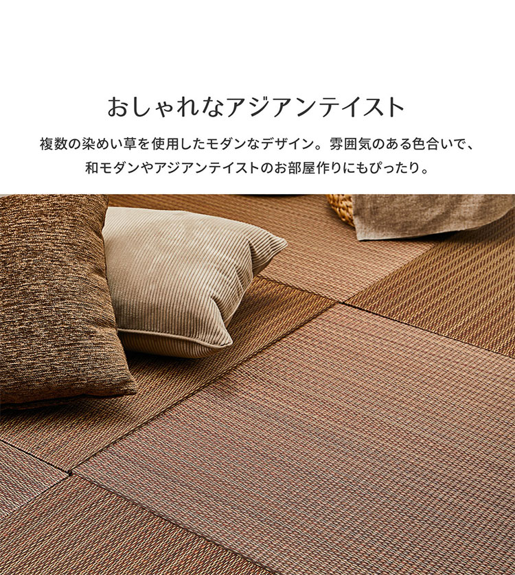 床に並べるだけで簡単に畳のスペ-スが作れる「置き畳」です。軽量なので女性1人でも取り扱いがラクラク。ちょっとした隙間スペ-スを有効活用できるのでキッズ向けのプレイマットからシニアのお昼寝、お父さんお母さんのごろ寝スペ-スまで簡単に作れます。適度なくション性があり、階下への配慮や床のキズ防止など、子育て中にもうれしい便利グッズ。天然い草を使用し、等間隔な織り方でサラッとなめらかな手触り。い草の空気清浄や湿度調整機能で年中快適です。