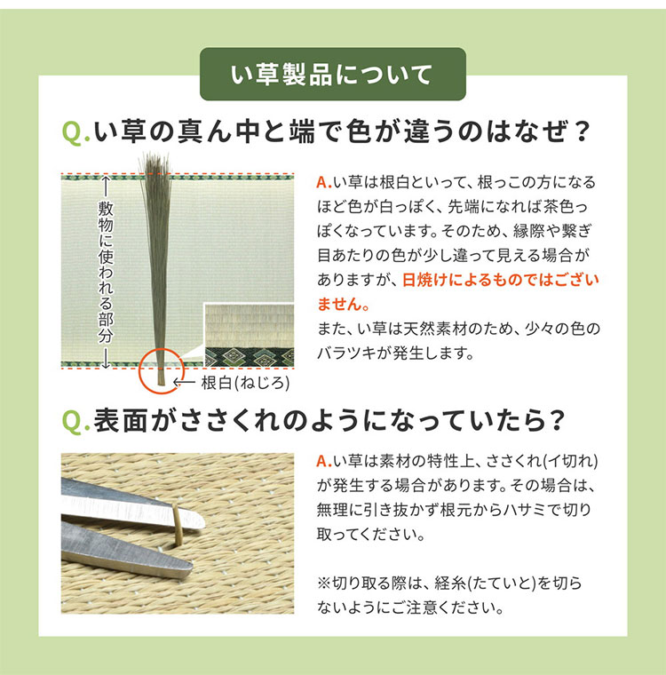 表面:い草100% 中材:ポリエチレン・ポリスチレン 裏面:不織布(滑りにくい加工付 裏面5カ所)