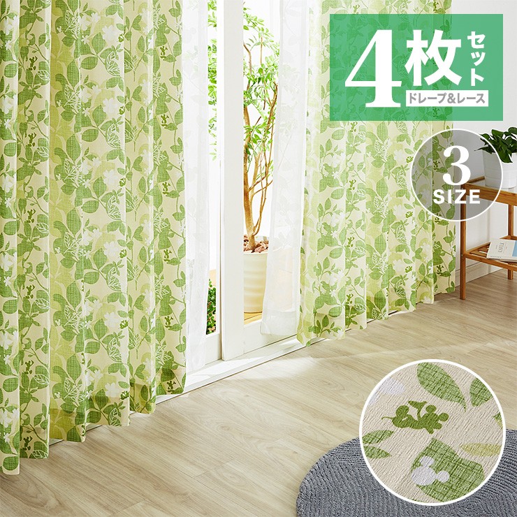 カーテン ディズニー disney 4枚セット ミッキー ミッキーマウス シルエット リーフ ドレープ レースカーテン付き 幅100 洗える 代引不可