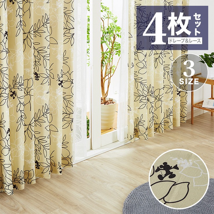 カーテン ディズニー disney 4枚セット ミッキー ミッキーマウス ミニー ミニーマウス ラインリーフ ドレープ レース 幅100 代引不可