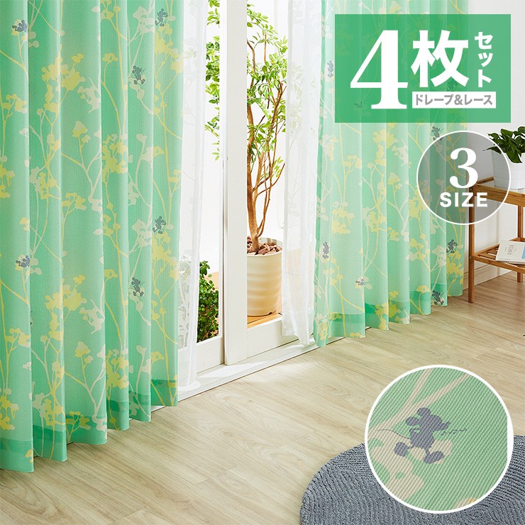 カーテン ディズニー disney 4枚セット ミッキー ミッキーマウス ブランチ柄 ドレープ レースカーテン付き 幅100 洗える 代引不可