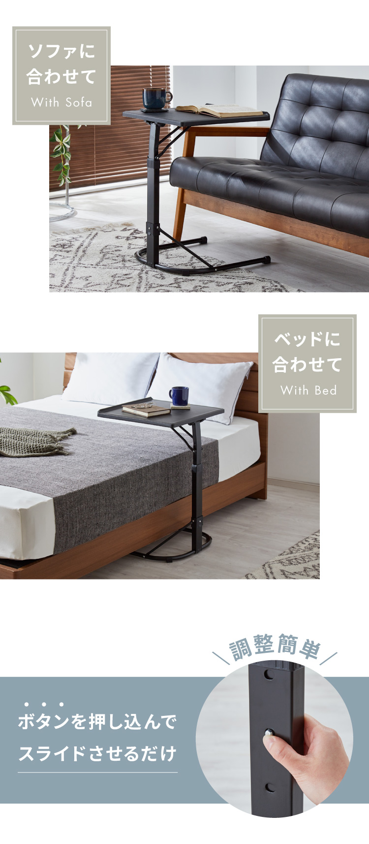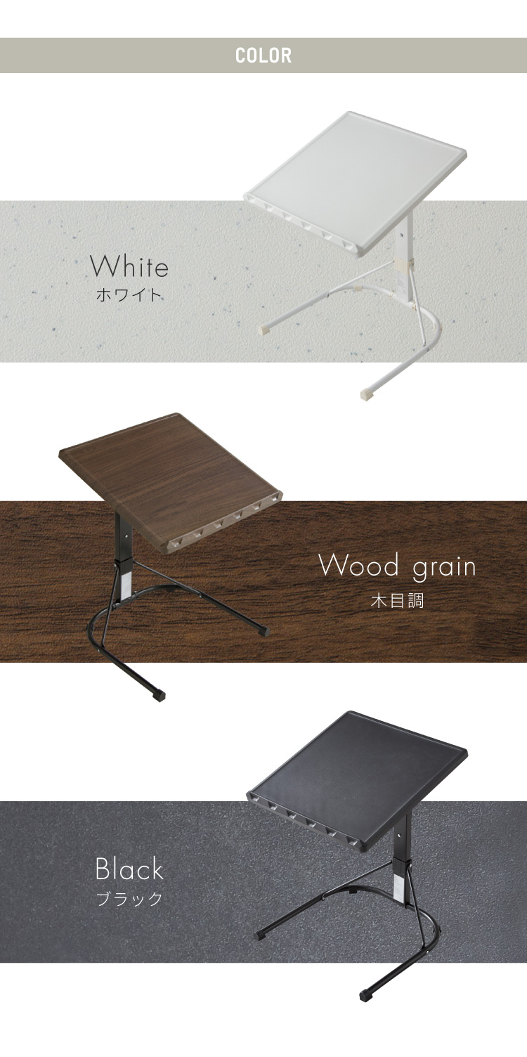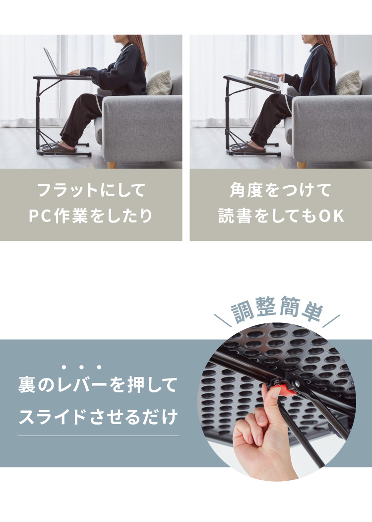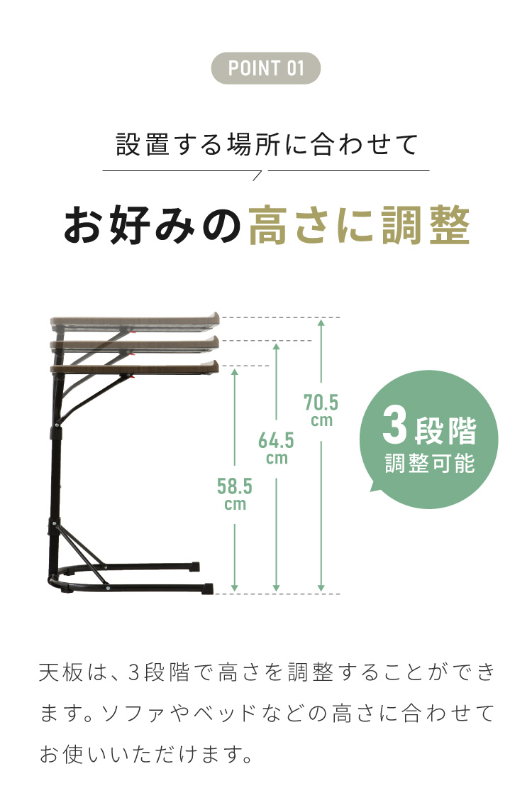 天板は3段階の高さ調整ができて、ソファやベッド等の高さに合わせてお使いいただけます。