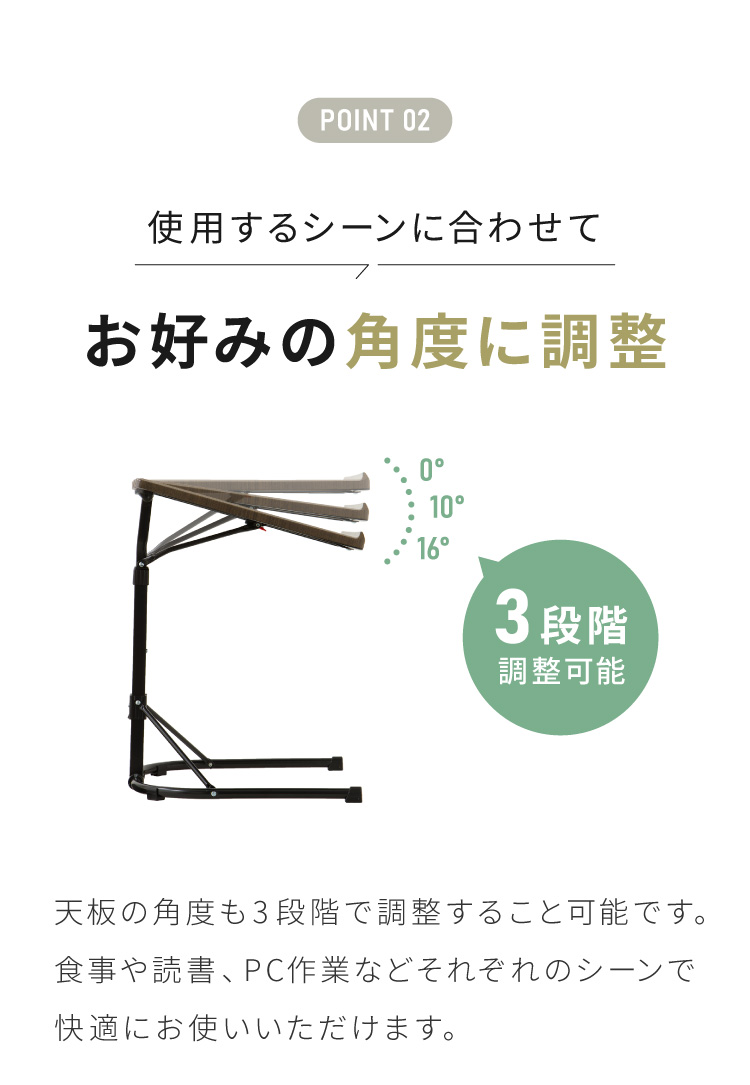 天板の角度は3段階の角度調整ができるので、お食事や読所、パソコン作業等に応じて切り替えることができます。